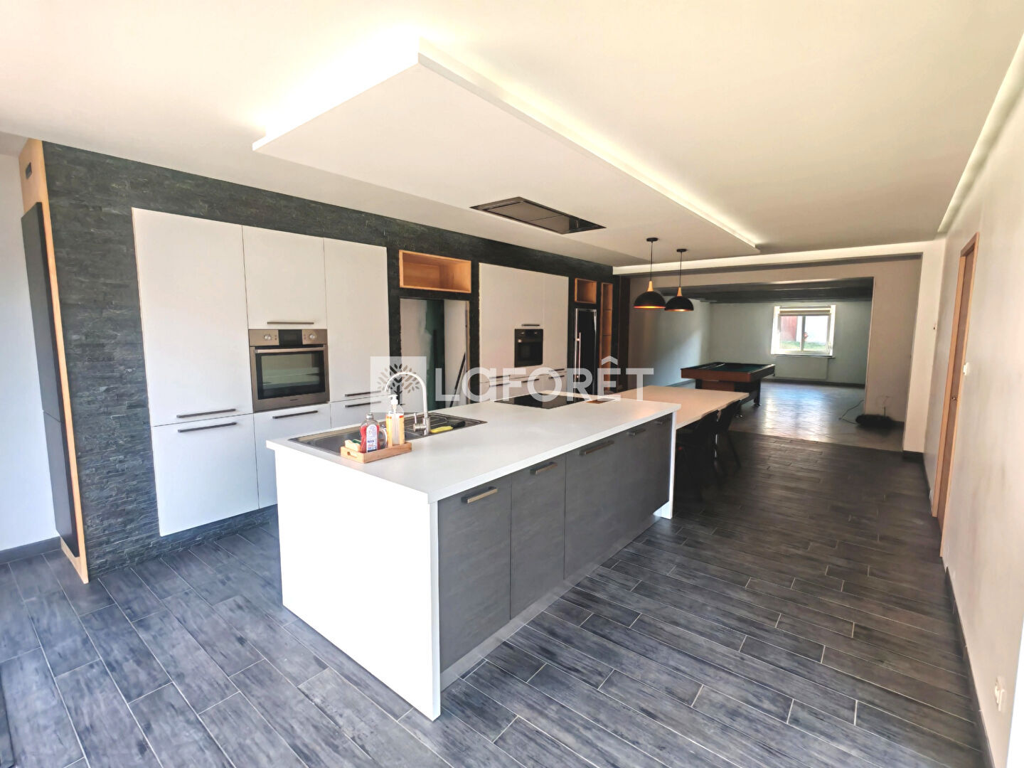 Superbe maison entièrement rénovée comprenant une vaste entrée, une cuisine moderne et équipée avec un accès direct à l'extérieur et ouverte sur la pièce de vie.