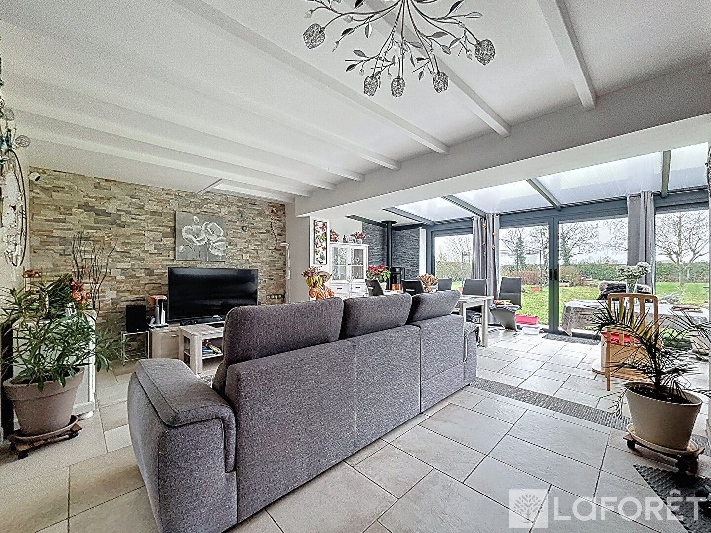Elle se compose d'une grande pièce de vie lumineuse, ouverte sur le jardin, offrant un espace convivial et chaleureux pour toute la famille.