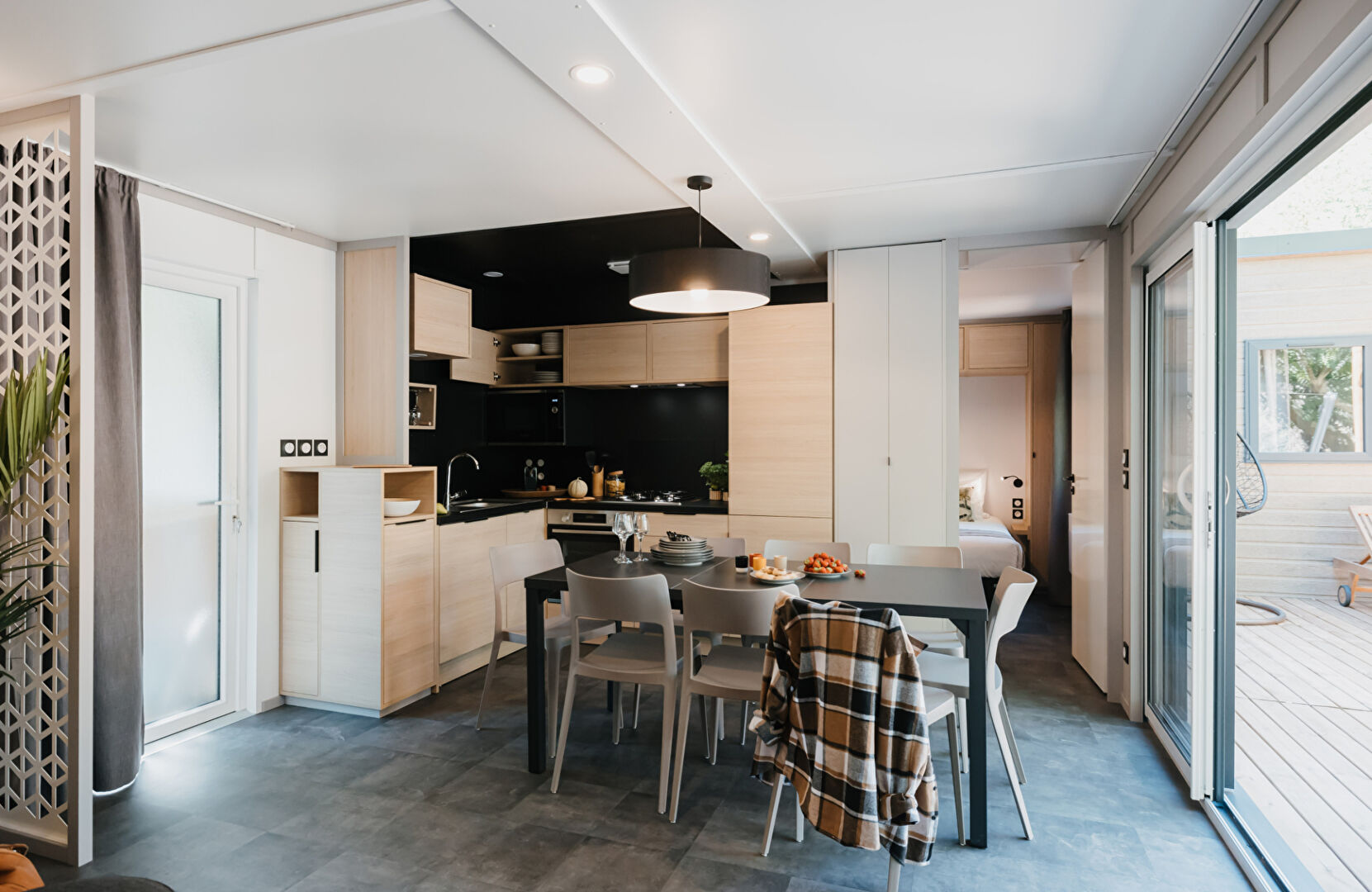 Implanté sur une belle parcelle arborée de 440m², ce lodge indépendant marie harmonieusement élégance contemporaine et authenticité champêtre. Conçu pour offrir confort et sérénité, il vous accueille dans un cadre préservé où la nature est omniprésente.