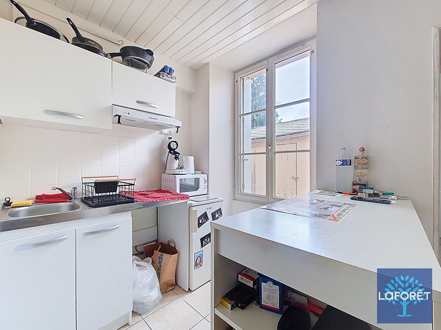 Un second appartement de type F2 comprenant une entrée, une cuisine, une pièce de vie, une chambre et une salle d'eau avec WC, loué 520 euros charges comprises.