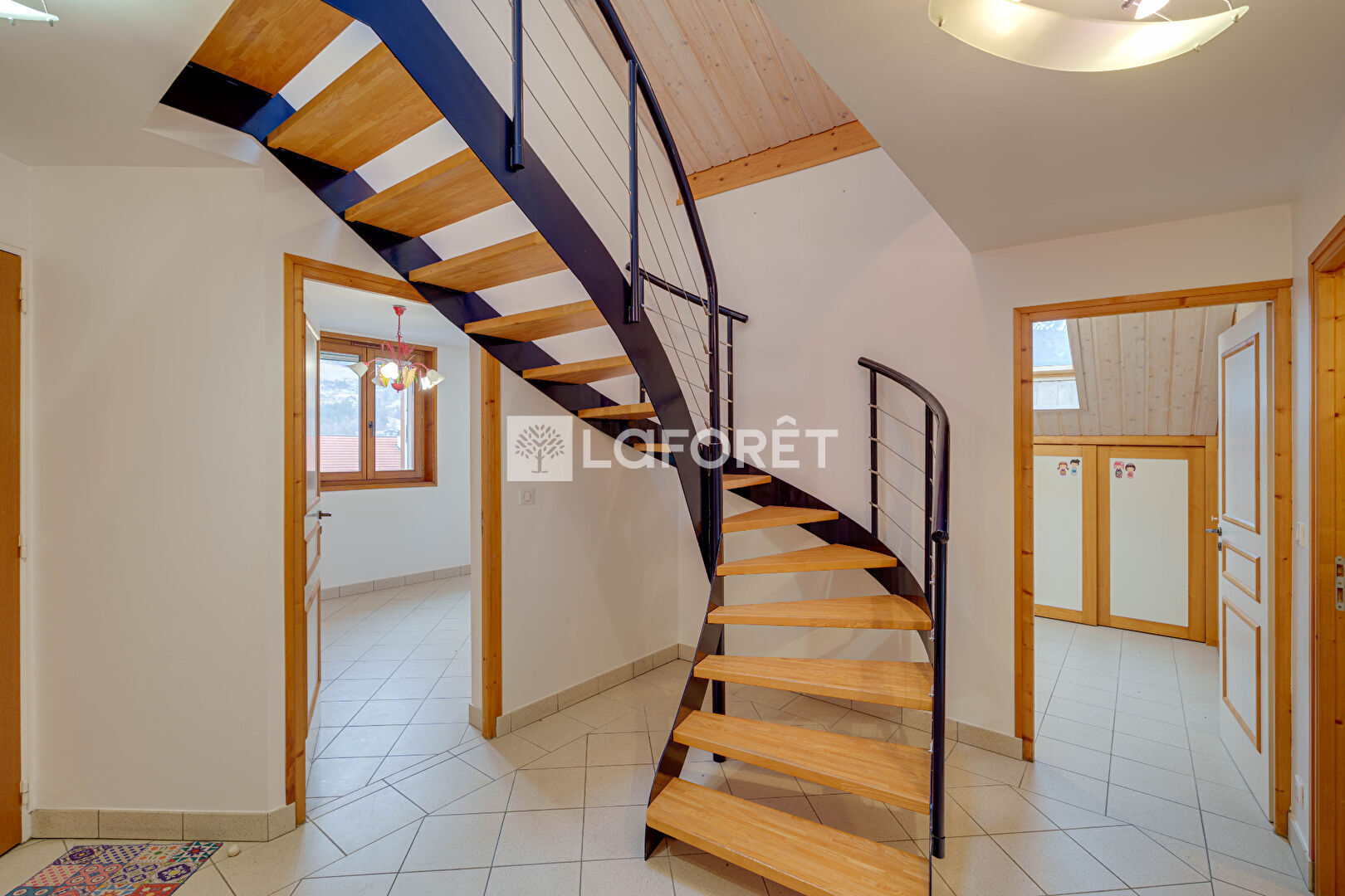 Dès l'entrée, les nombreux rangements donnent le ton d'un intérieur fonctionnel et bien agencé sublimé par un bel escalier qui structure l'espace et apporte du caractère à l'appartement.