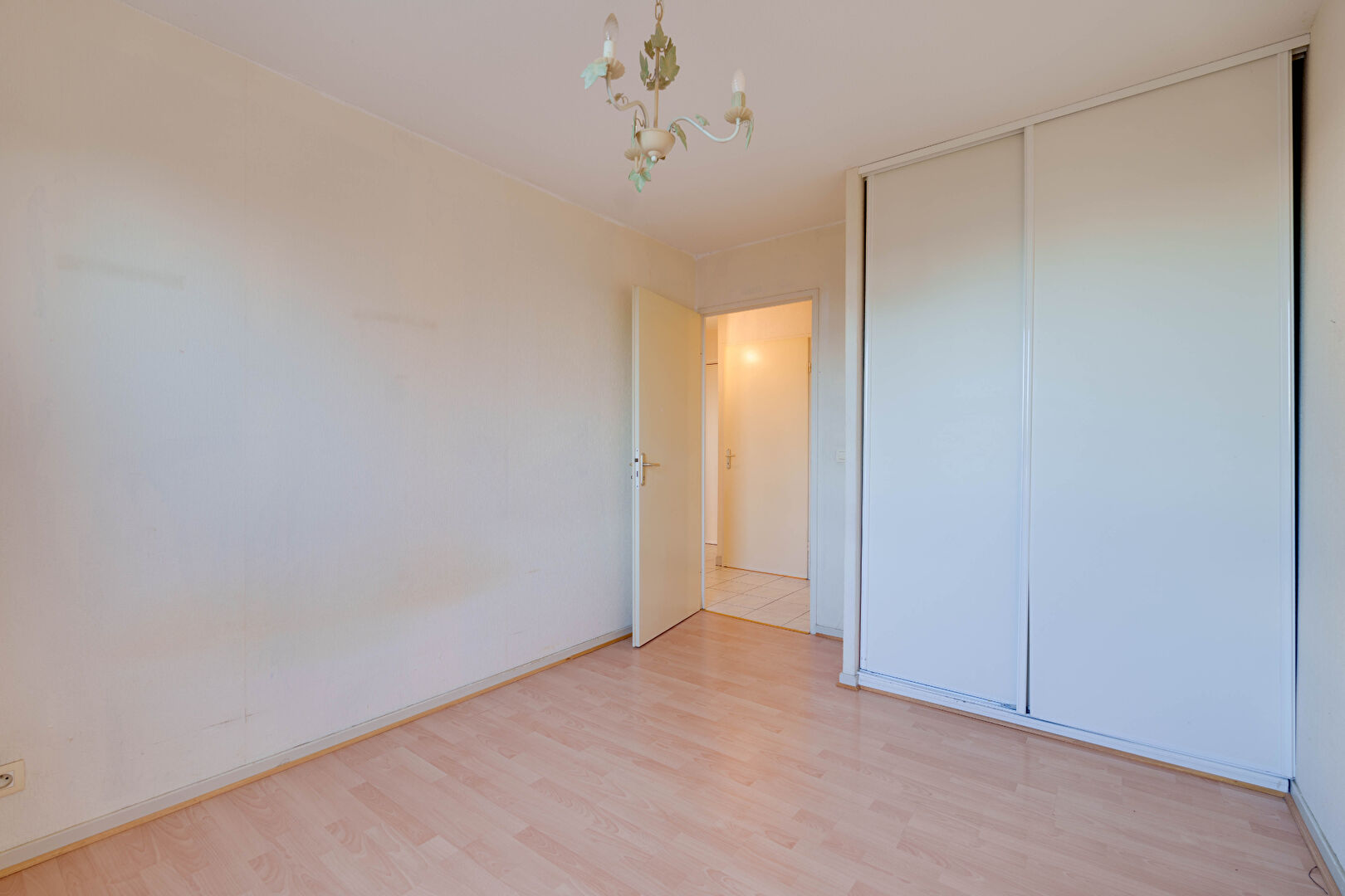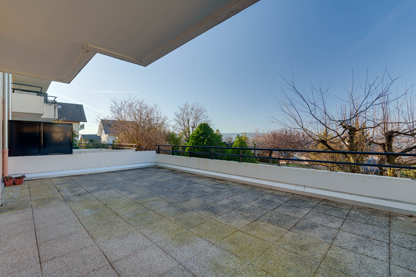 L'appartement comprend également une chambre de 10 m² avec placard et vue sur la terrasse, une salle de bains de 3,65 m² ainsi qu'un WC séparé.