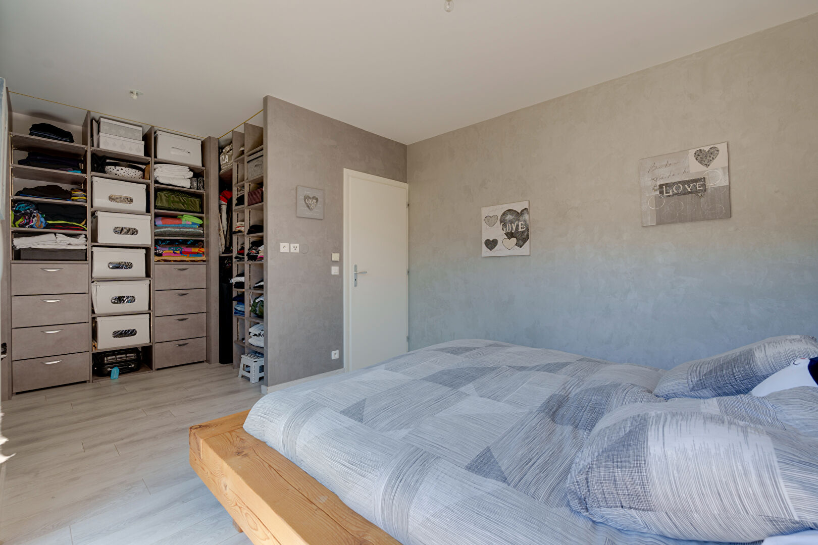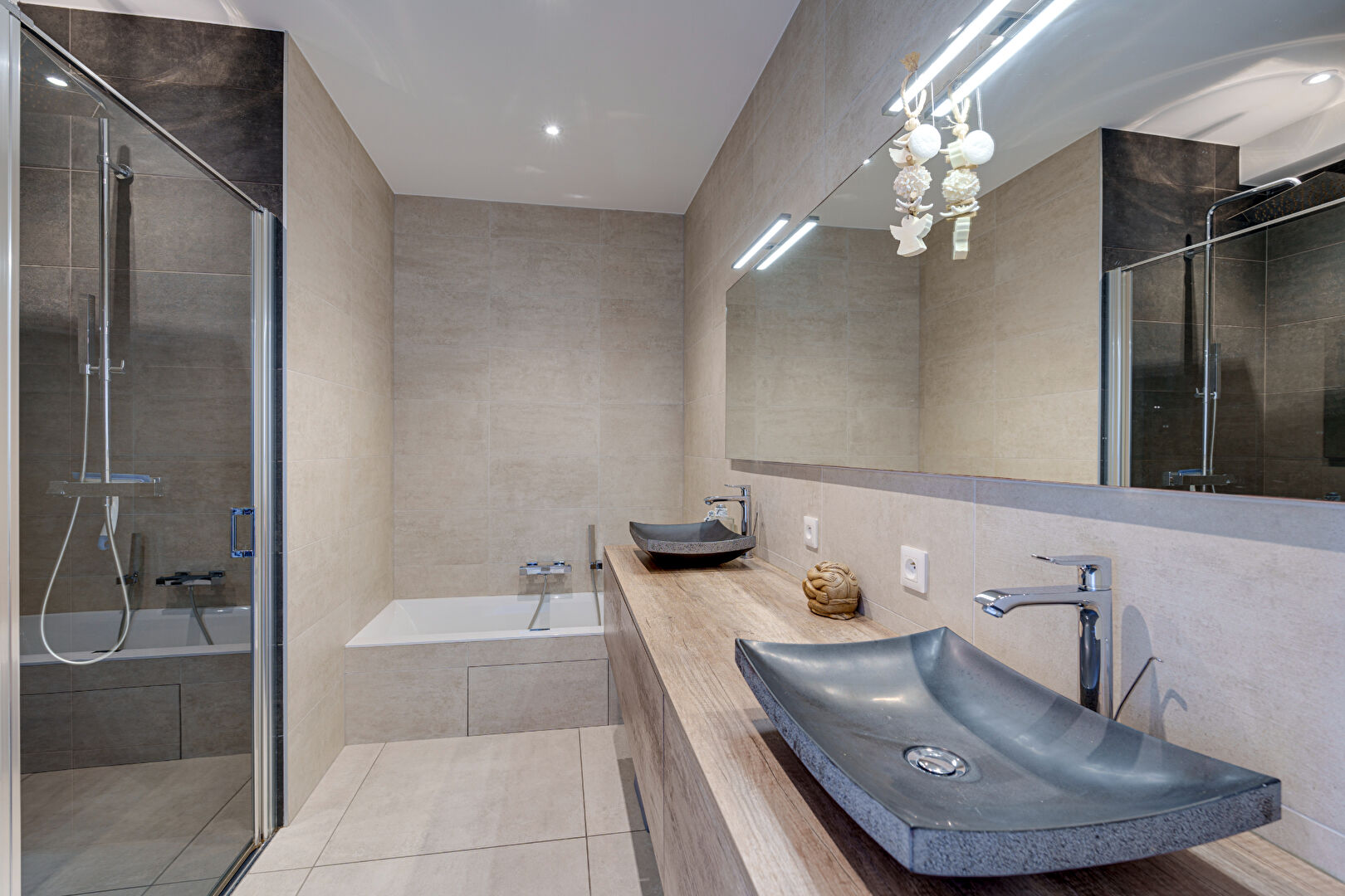 La salle de bain de 6 m² est équipée d'une double vasque et d'une douche à l'italienne, tandis que deux chambres spacieuses, dont l'une avec un magnifique dressing, complètent cet appartement haut de gamme.