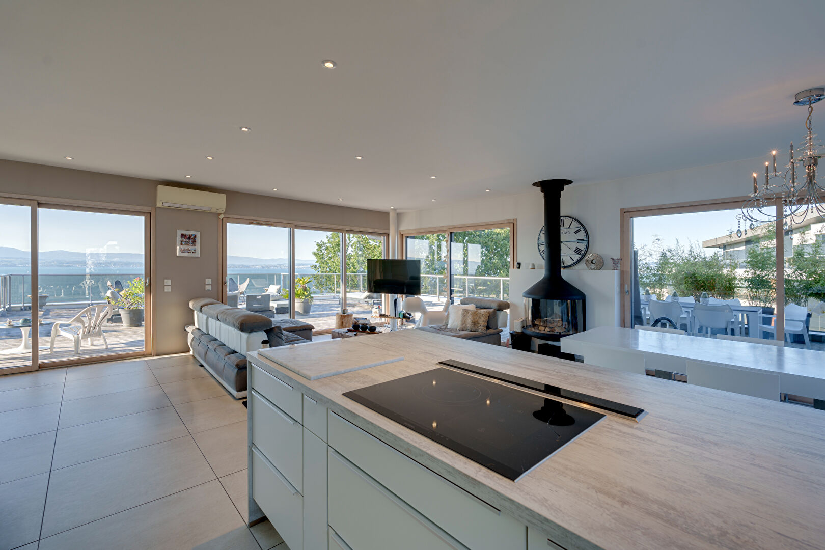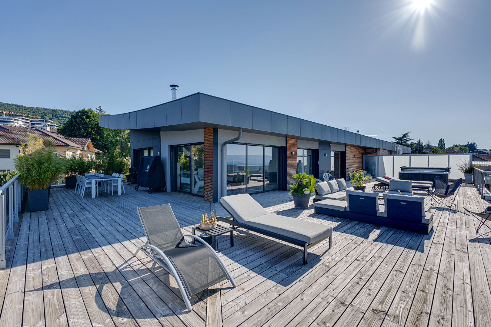 L'extérieur, quant à lui, vous offre une vaste terrasse de plus de 240 m², qui entoure l'appartement, avec une dalle renforcée et un jacuzzi 4 places, pour profiter de nuits magiques sous les étoiles, avec une vue imprenable sur le lac.