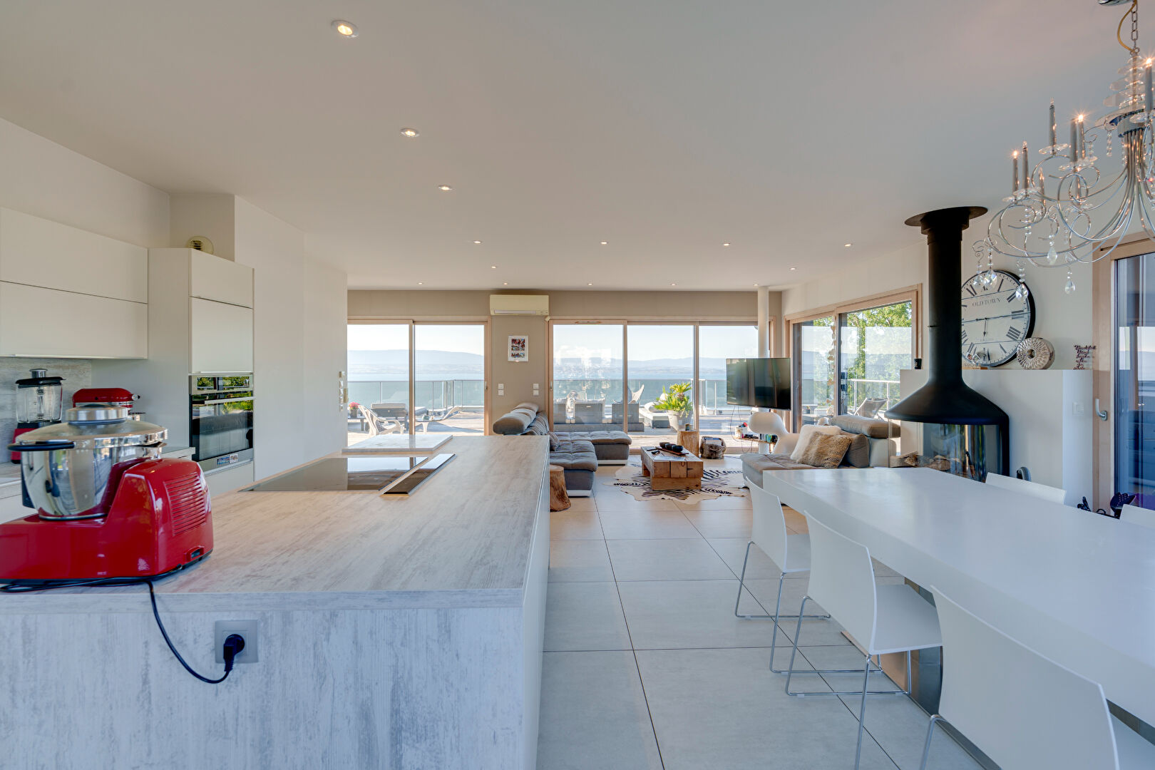 L'intérieur est conçu pour allier luxe et confort. Le salon/cuisine de 50 m², avec ses immenses baies vitrées, offre une vue plongeante sur la terrasse et le lac, apportant une luminosité incomparable à l'espace de vie. Un petit bureau, idéal pour le télétravail, vous permet de travailler face à ce panorama inégalé.