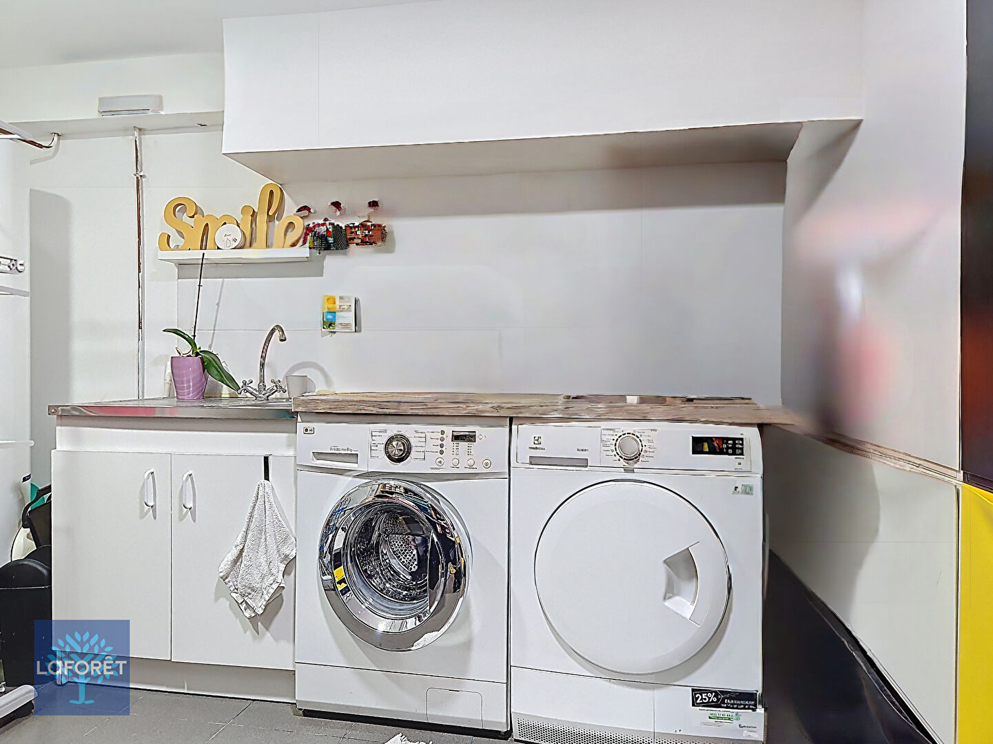 Espace modulable : Garage aménagé en buanderie, avec possibilité de réaménagement selon vos besoins (garage, stockage, etc.).