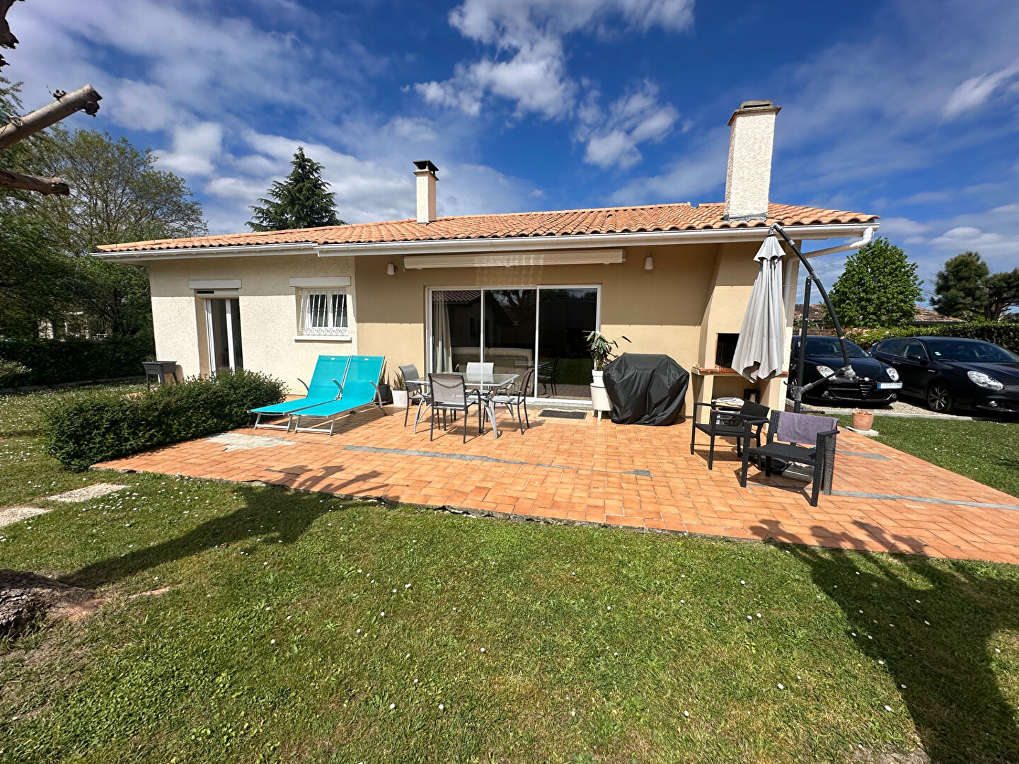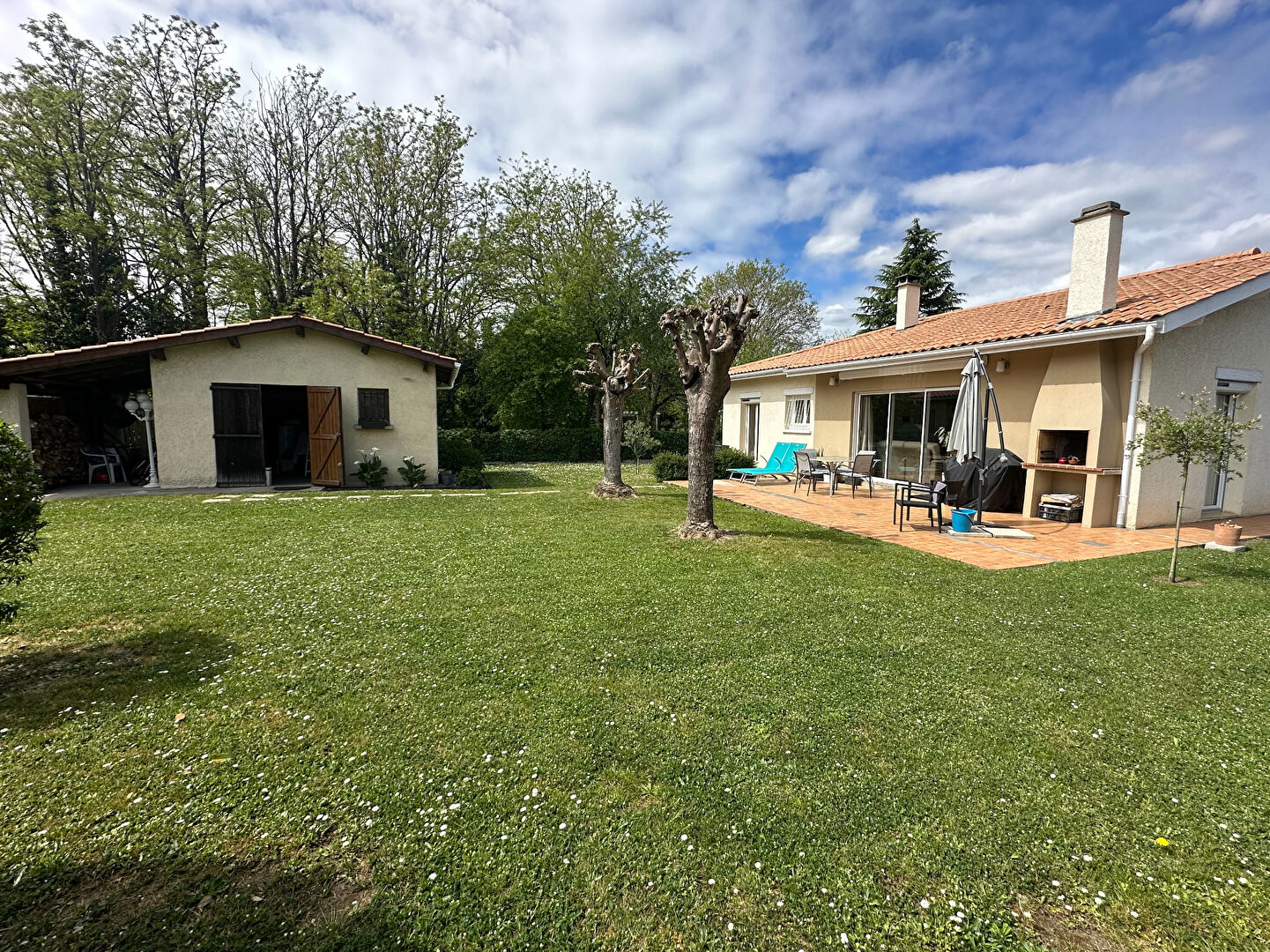 Agréable jardin avec terrasse, store banne, dépendance.