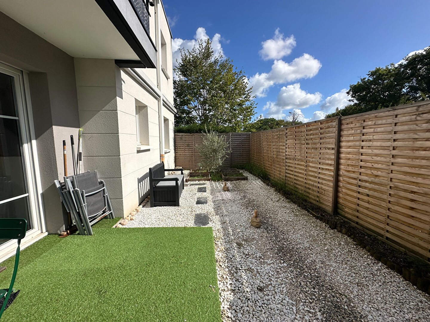 Salon donnant sur jardin clôturé sans vis à vis avec terrasse.