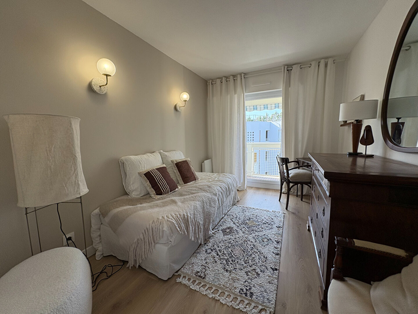 Composé d'une entrée avec placard, une cuisine aménagée et équipée avec son balcon, un salon/salle à manger, un dégagement, deux chambres, une salle de bains avec un WC et un balcon.