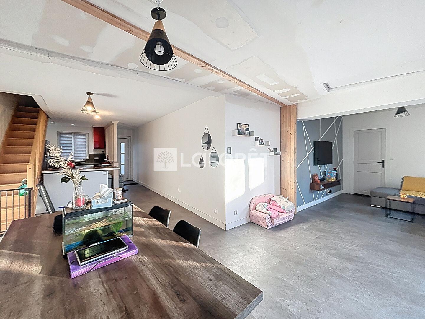 Au rez-de-chaussée : une entrée, une cuisine aménagée et équipée ouverte sur le salon/salle à manger, un bureau d'environ 8 m², une chambre ainsi qu'une salle d'eau.