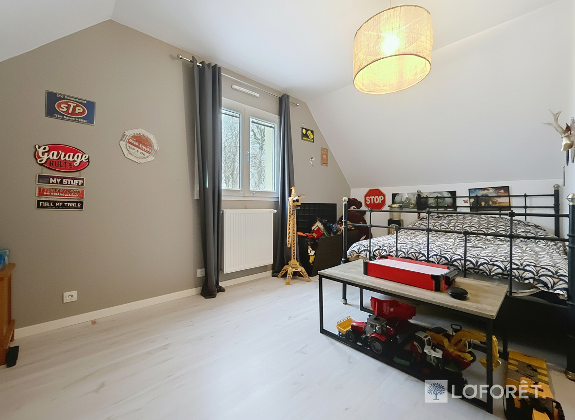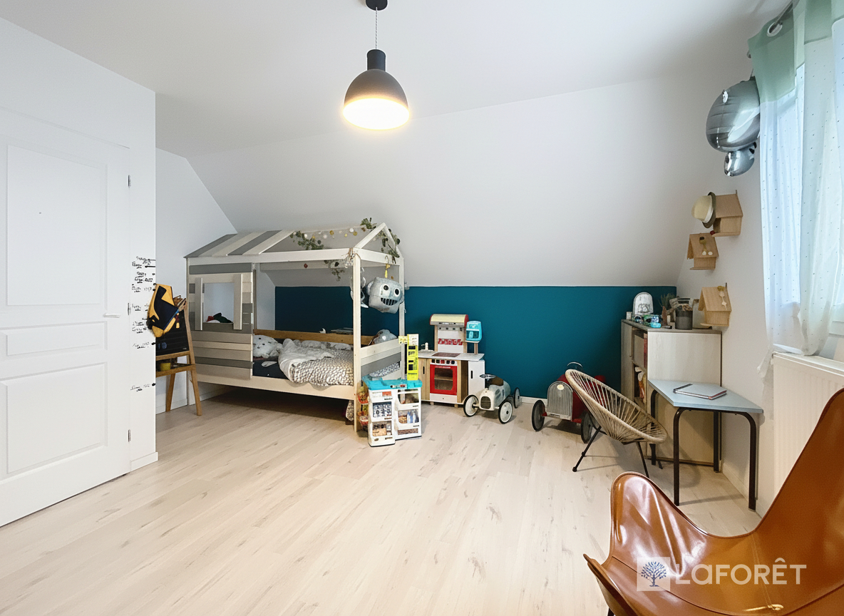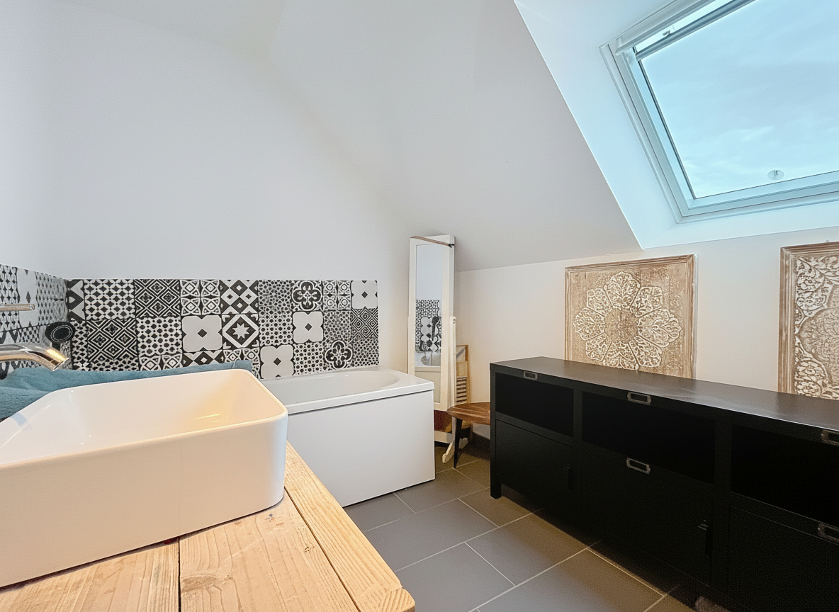 À l'étage, une vaste pièce palière, idéale pour un bureau ou un salon, dessert deux grandes chambres et une salle de bains supplémentaire.