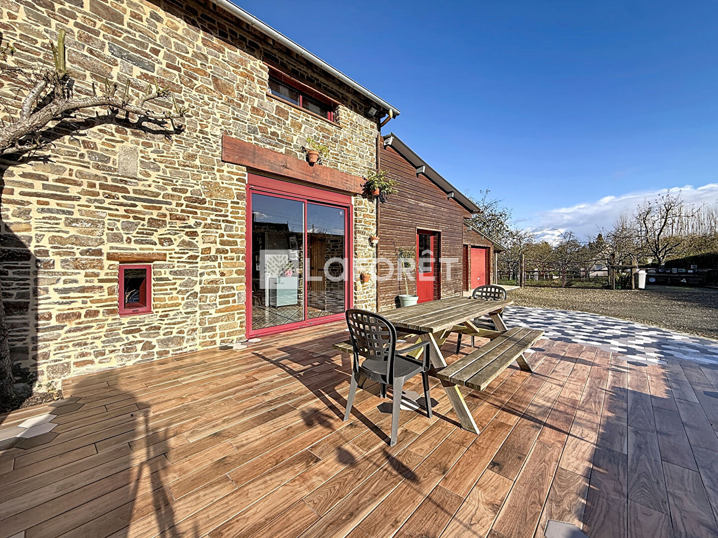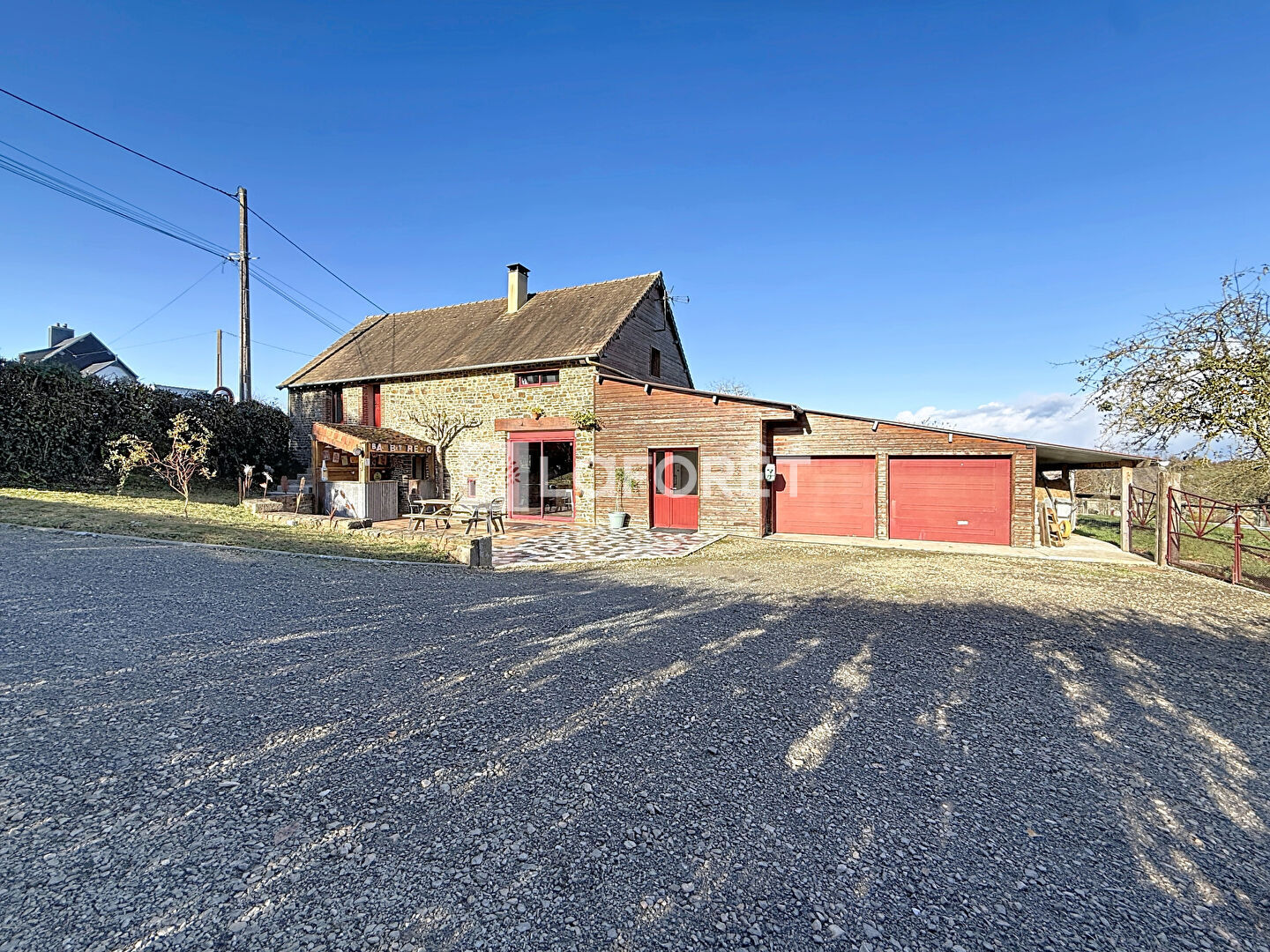Dans un environnement calme et agréable, entourée de pommiers, proche de l'axe Tinchebray-Vire, ancienne grange réhabilitée en 2010 offrant de beaux volumes, implantée sur un terrain d'environ 1500 m² avec double garage et dépendances.
