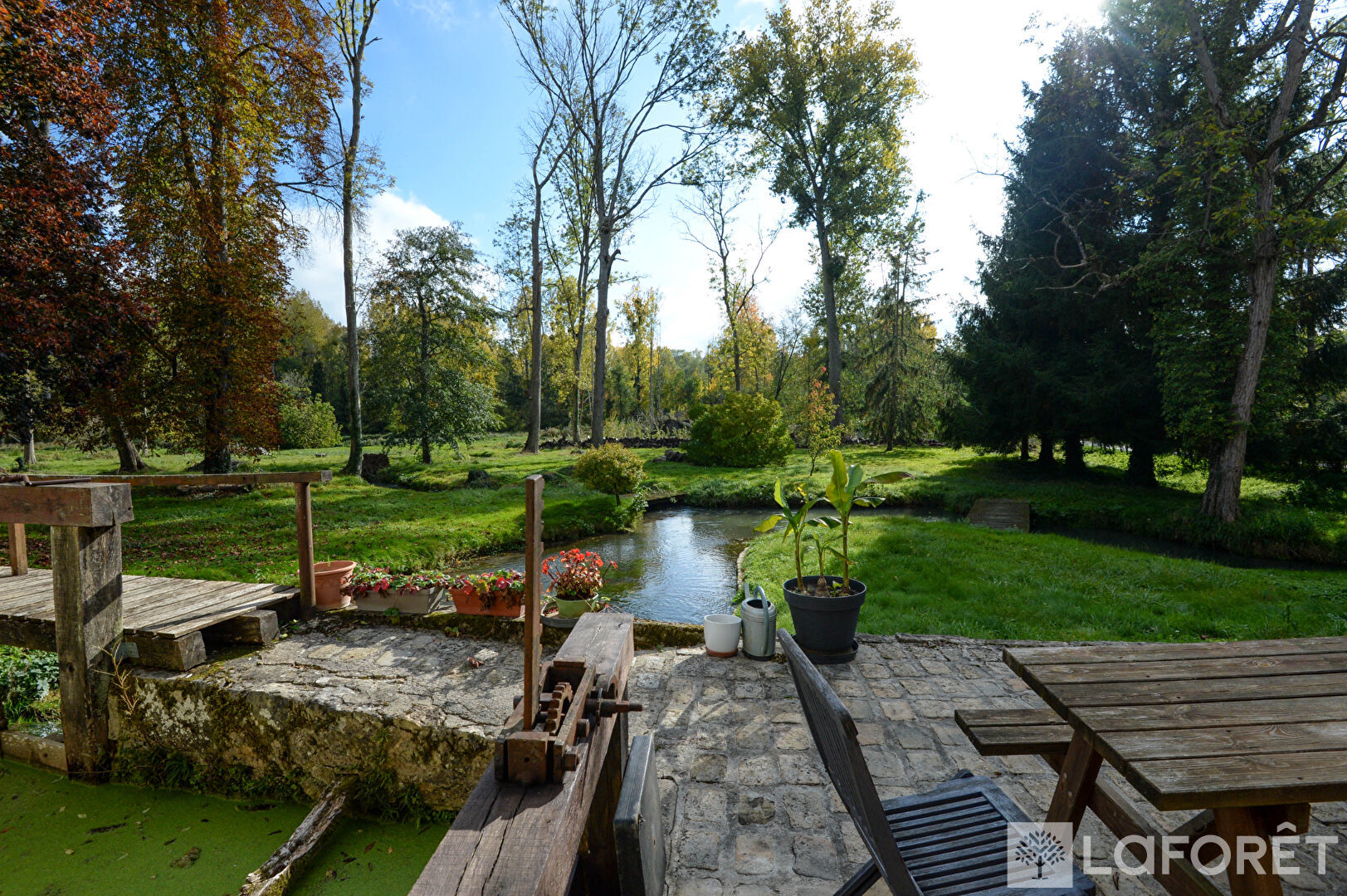 En bordure de l'Orvanne, une belle terrasse pavée invite à la sérénité et à la contemplation.