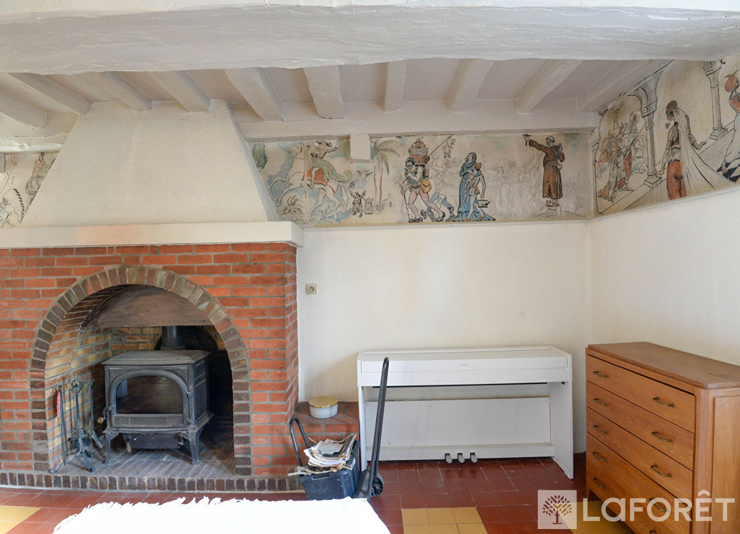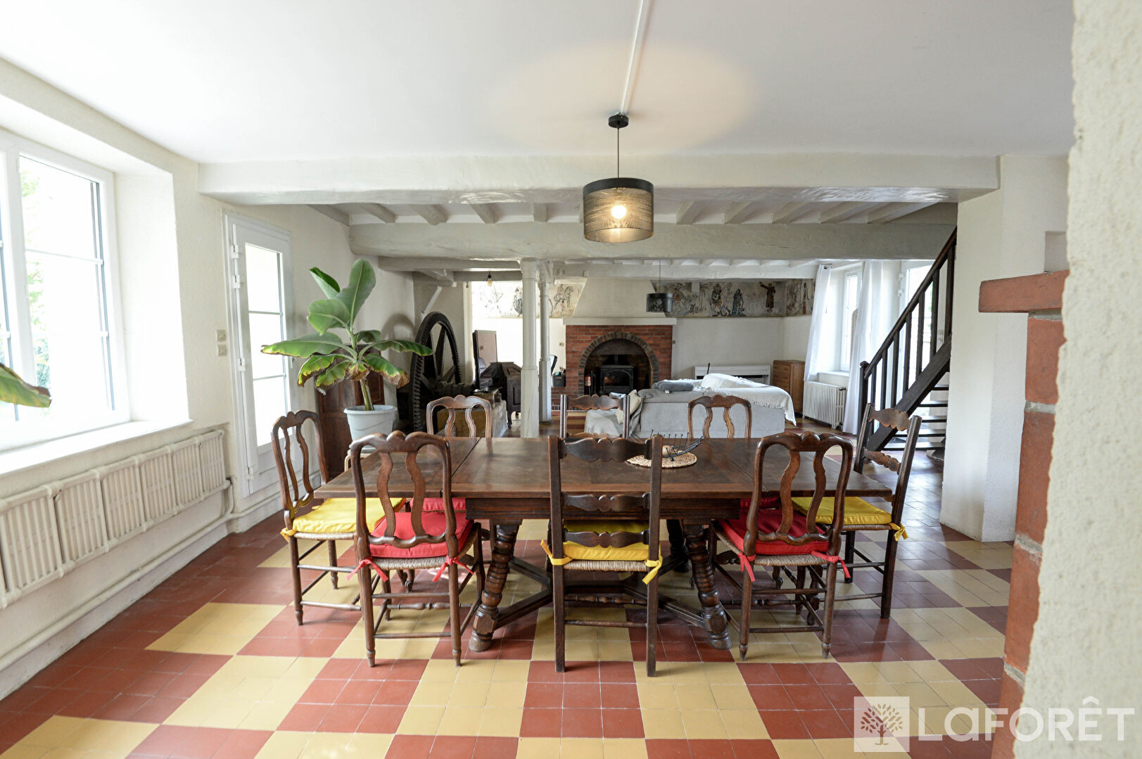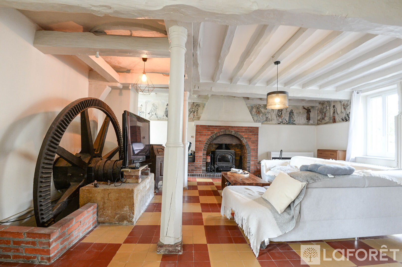 Le rez-de-chaussée accueille une entrée chaleureuse menant à une cuisine aménagée, puis à une vaste pièce de vie comprenant une salle à manger avec cheminée à insert et un salon convivial avec poêle à bois. Le charme de l'ancien est omniprésent, avec notamment la roue du moulin (non fonctionnelle) et de magnifiques fresques d'époque.