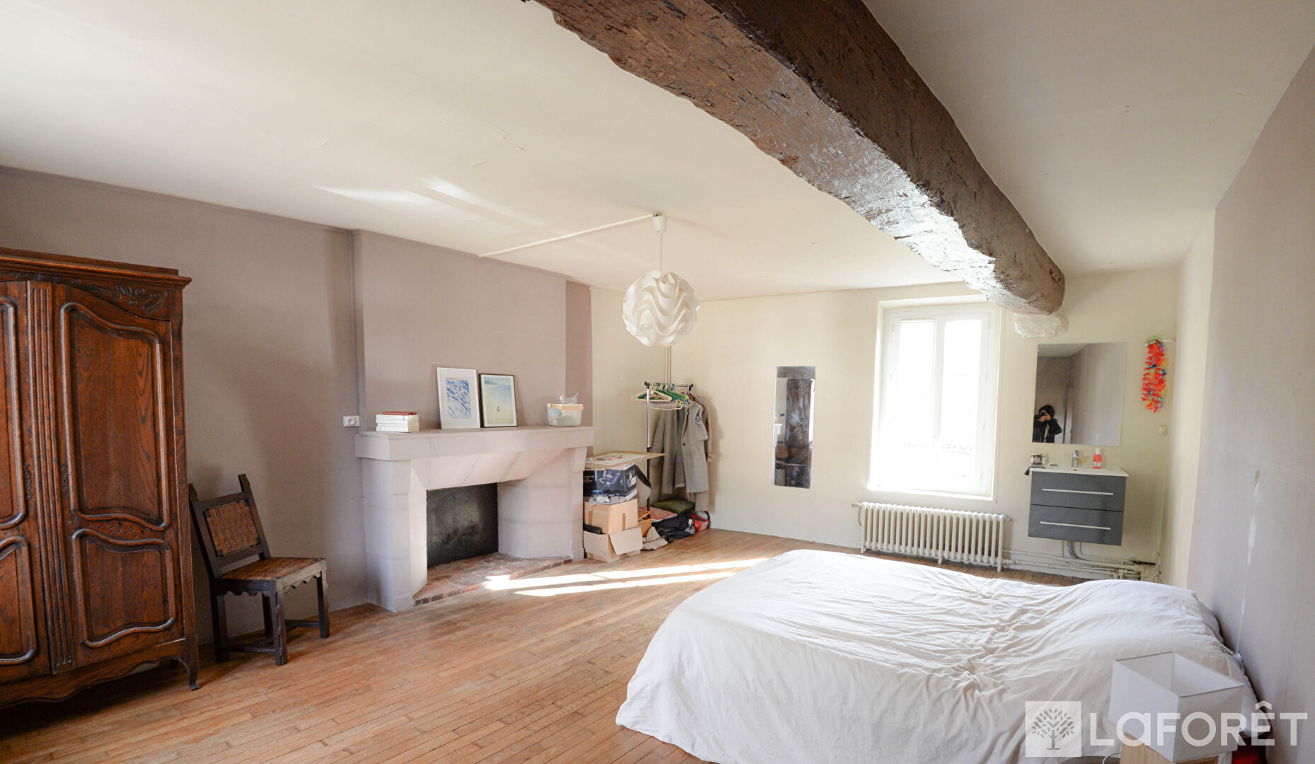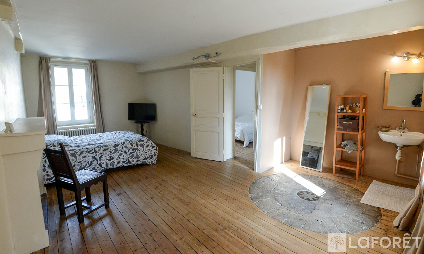 À l'étage, un palier dessert une grande chambre avec cheminée et point d'eau, une salle de bains, une chambre d'appoint ainsi qu'une spacieuse chambre supplémentaire dotée d'un point d'eau, d'une cheminée et de toilettes indépendantes.