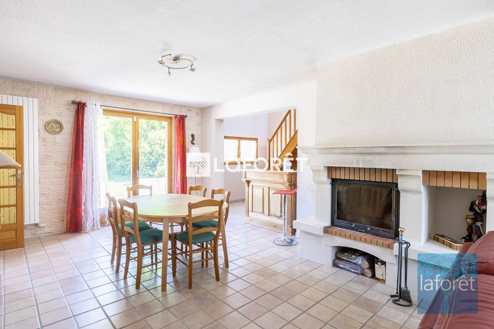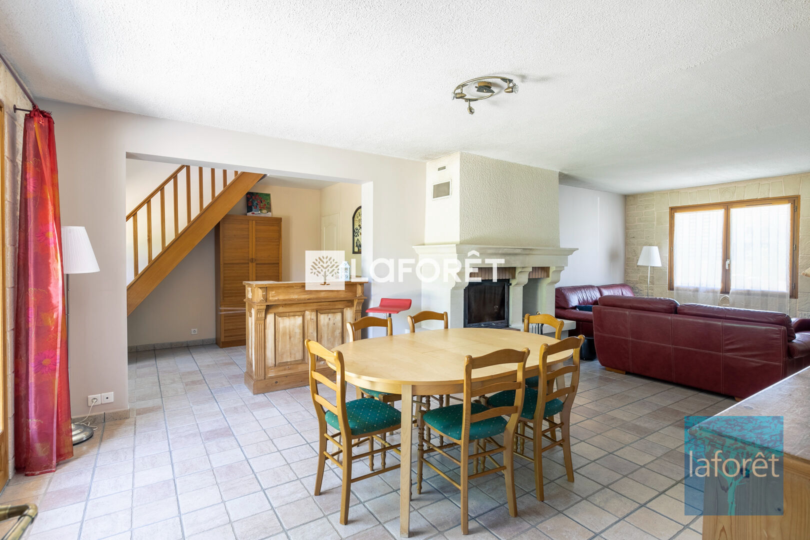 Le rez-de-chaussée comprend une entrée avec rangements, un double séjour doté d'une cheminée à insert, une cuisine équipée, un espace pouvant servir de bureau ou de chambre en mezzanine, ainsi que des WC séparés.