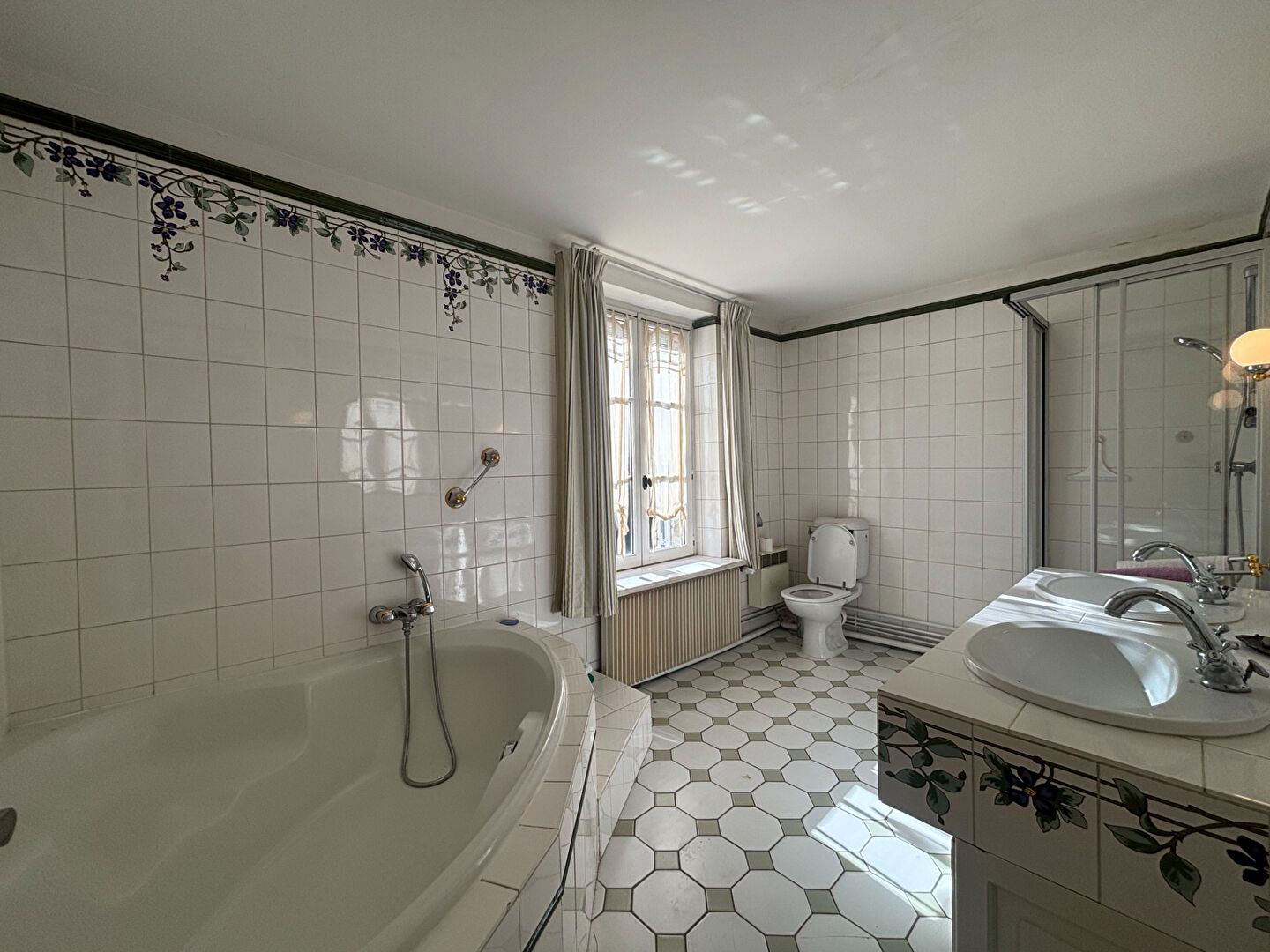 - Au premier étage, un dégagement distribuant cinq chambres, dont une en enfilade ; une salle de bains avec douche, baignoire et WC ; une pièce d'eau avec lavabo.