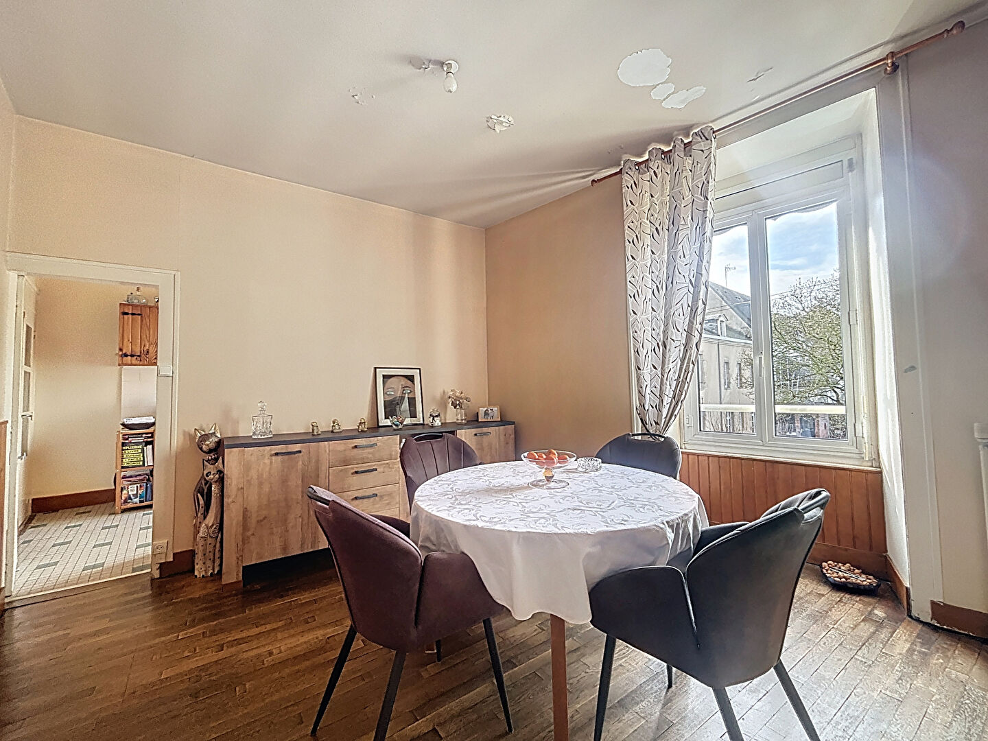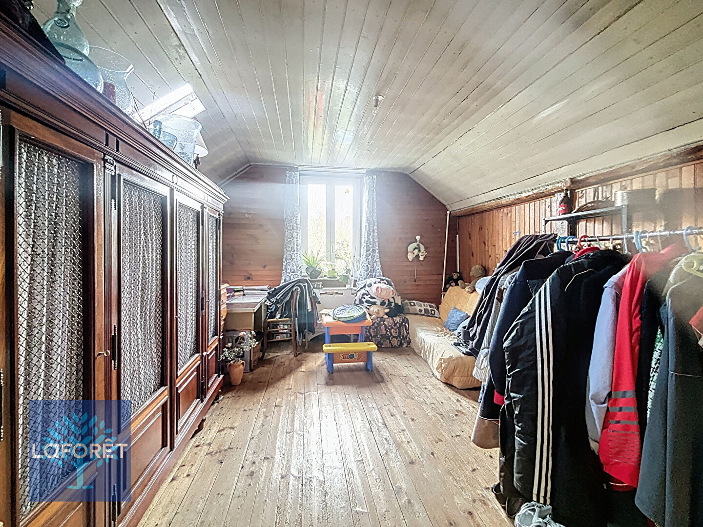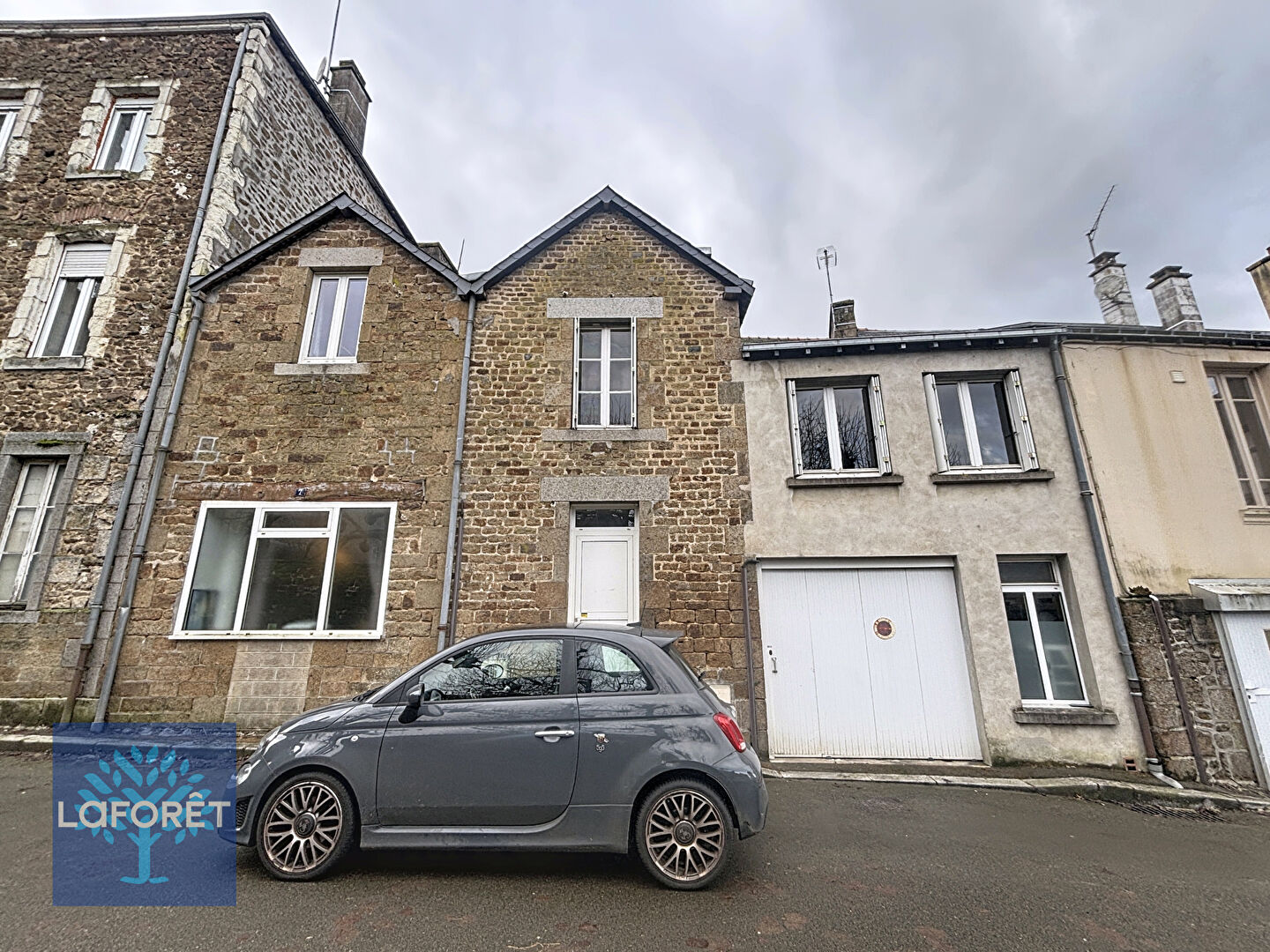 Au premier étage : un appartement T5 de 120 m² avec garage en RDC, cave et greniers. Loué 390€.