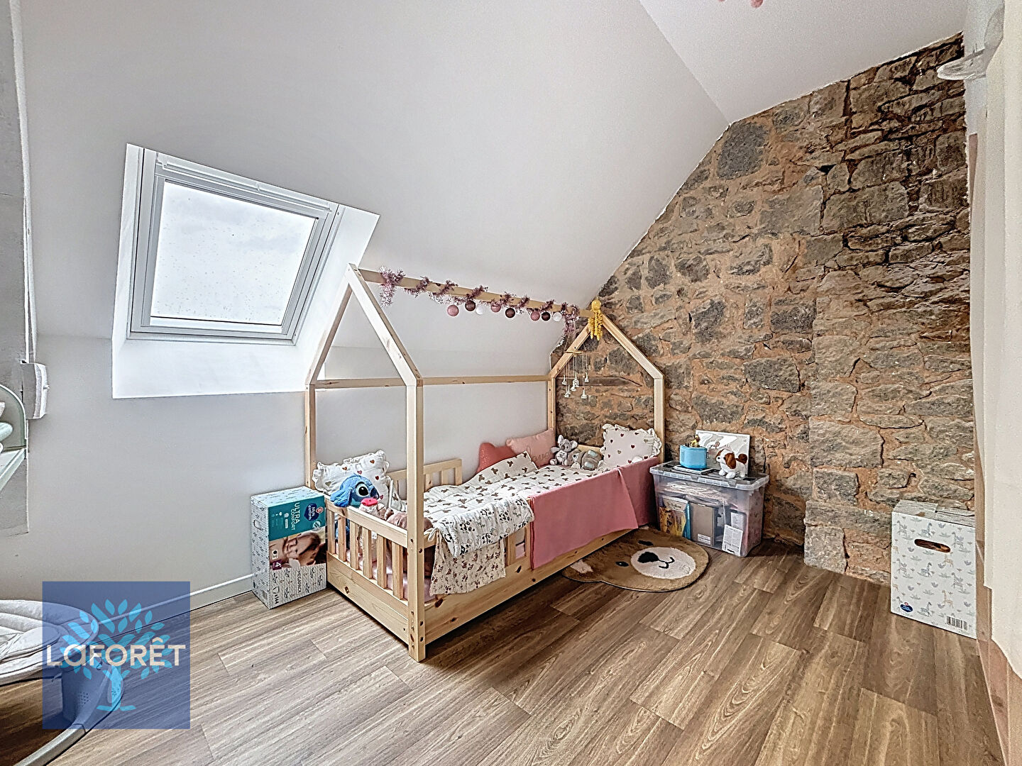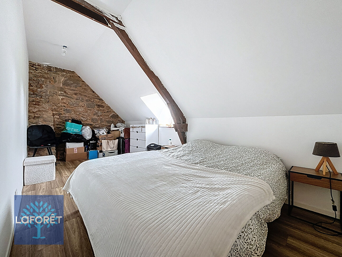 À l'étage, un palier dessert trois chambres : deux chambres déjà rénovées et une troisième à terminer selon vos envies. Une grande partie des matériaux nécessaires à sa rénovation restera sur place.