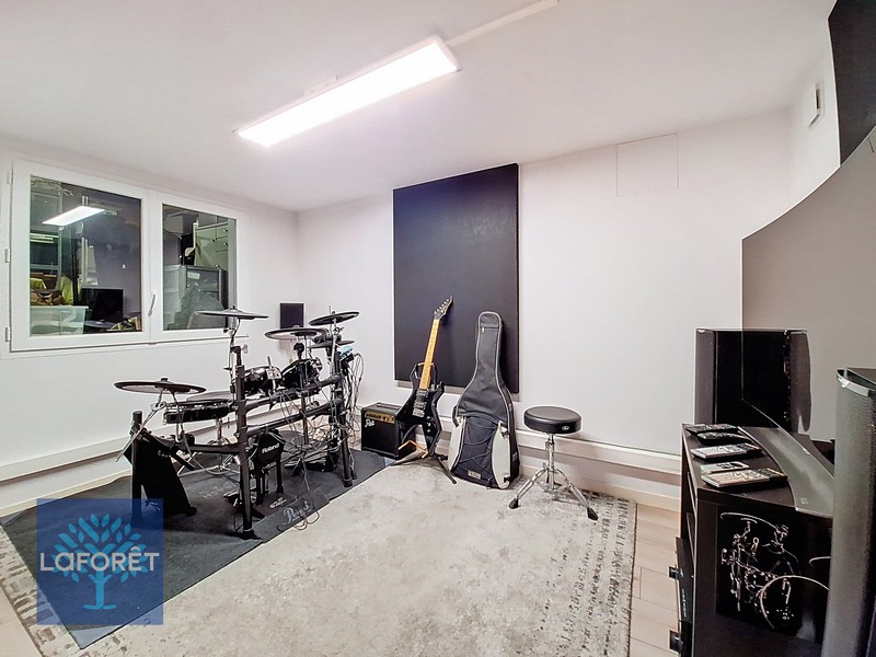 Sous sol partiel composé d'un garage avec porte motorisé, cave et une pièce entièrement insonorisée idéale pour pratiquer de la musique en toute tranquillité.