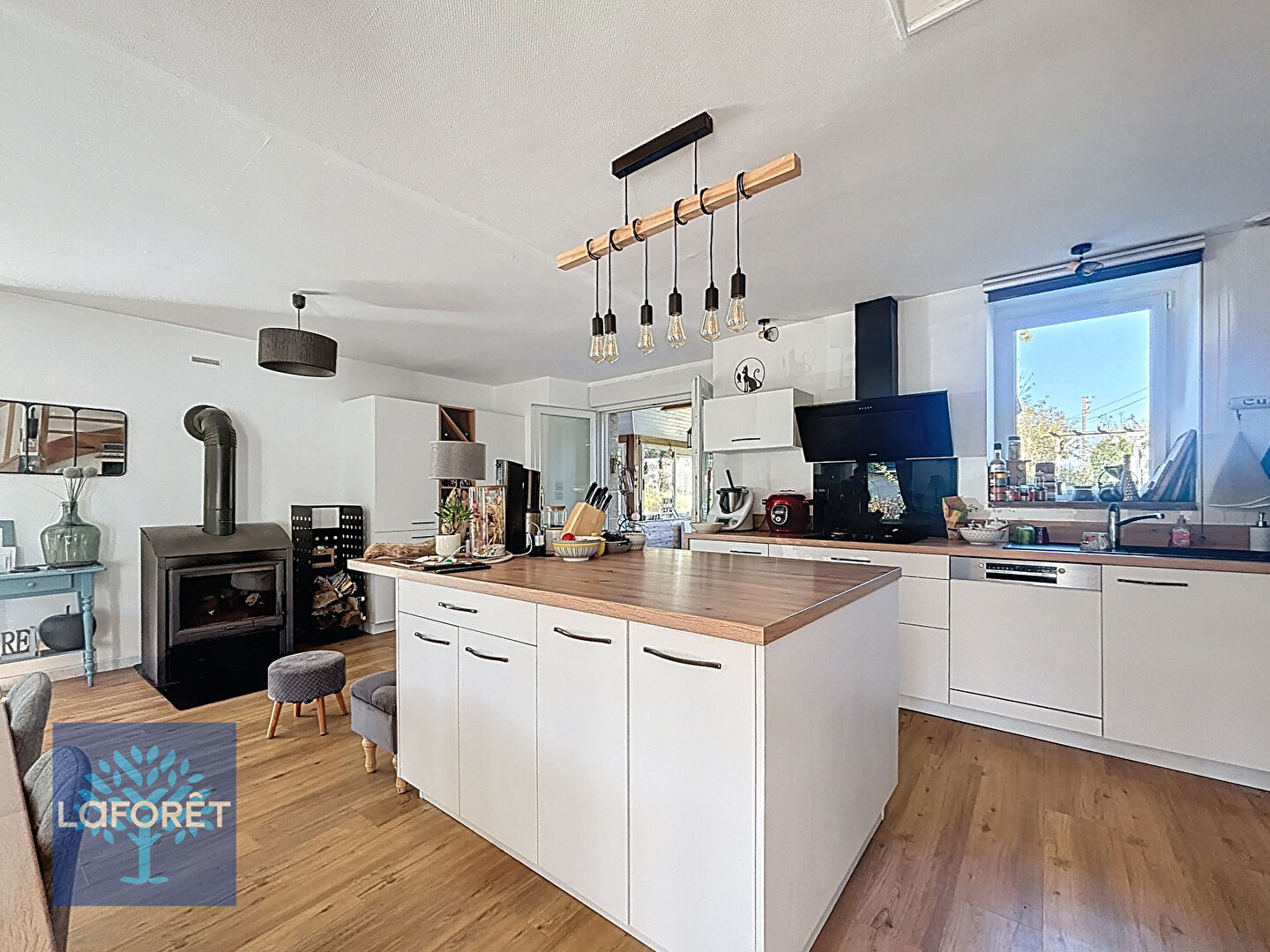 Vous trouverez au rez-de-chaussée, un salon lumineux, une cuisine aménagée et équipée avec insert bois, une véranda isolée, un bureau, une buanderie et une salle d'eau avec WC.