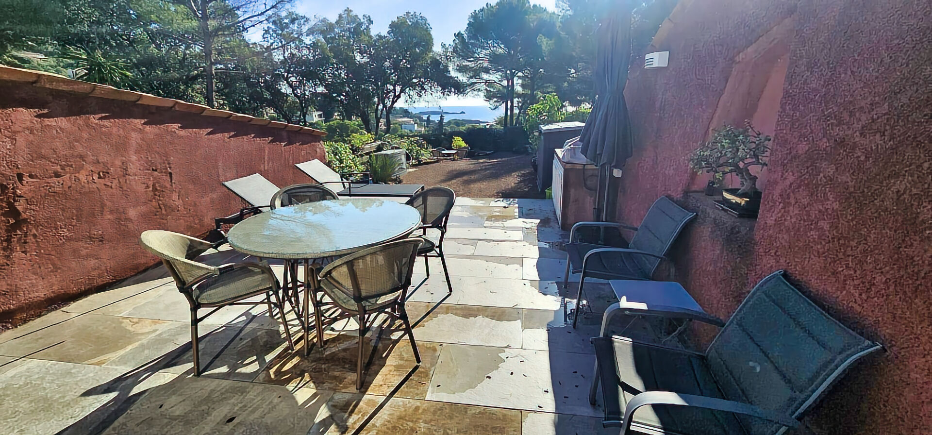 L'ensemble s'ouvre sur une grande terrasse aménagée avec cuisine d'été et barbecue, idéale pour recevoir, prolongée par un jardin privatif clos avec vue mer.