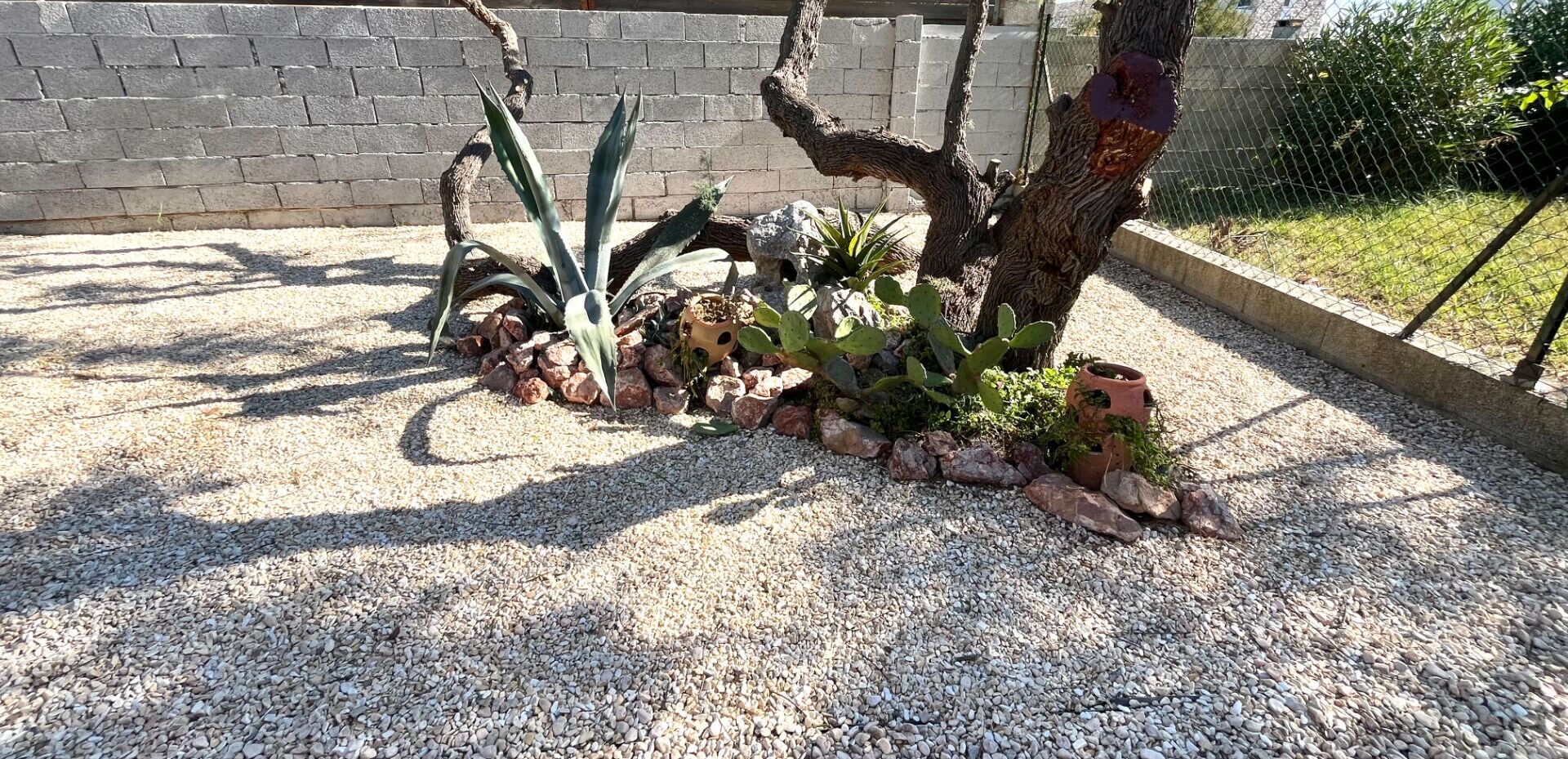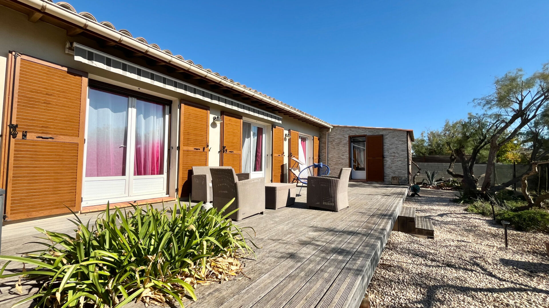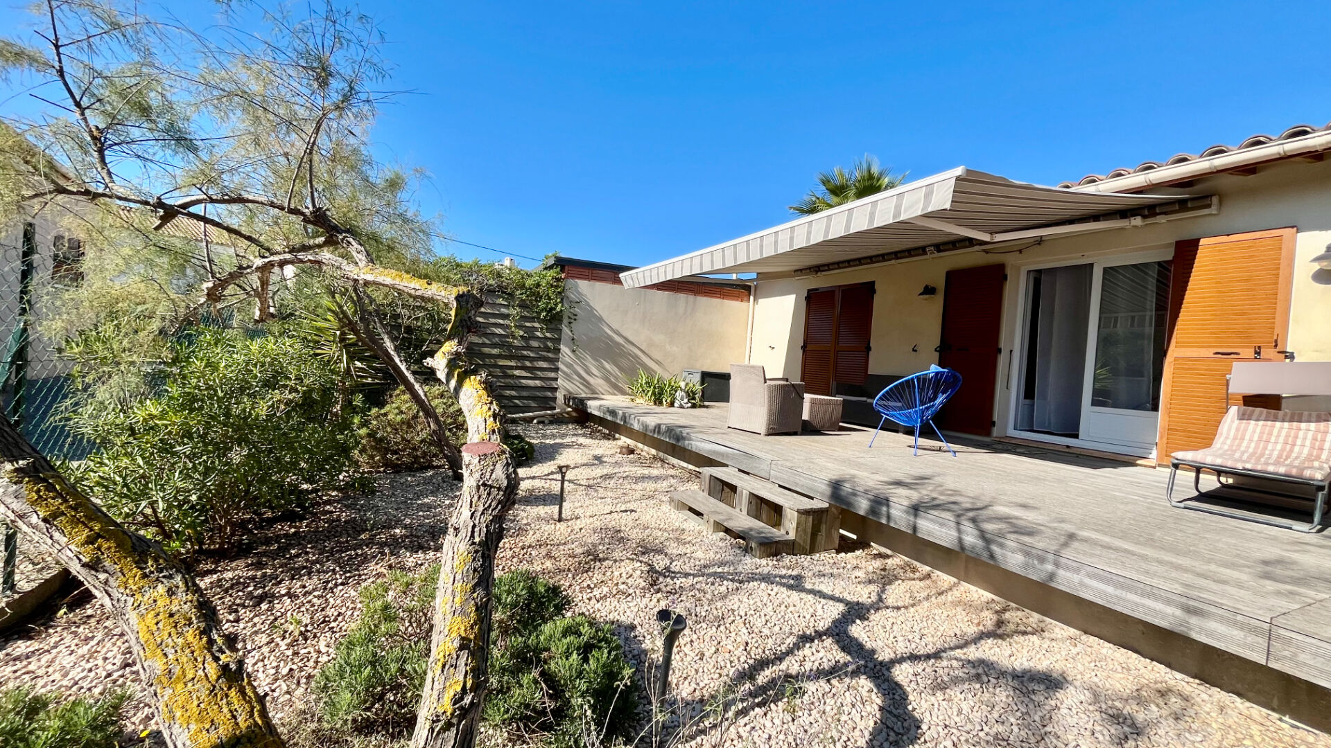 Dans le jardin, deux terrasses, la première pour profiter des belles journées ensoleillées, la seconde pour y déjeuner.