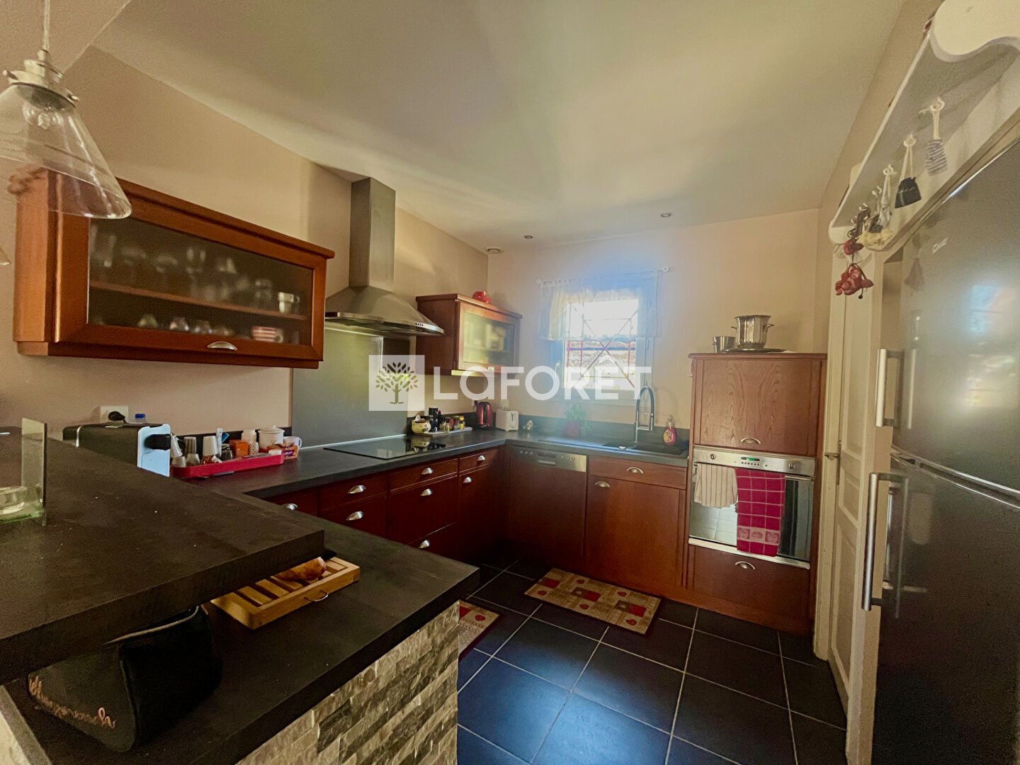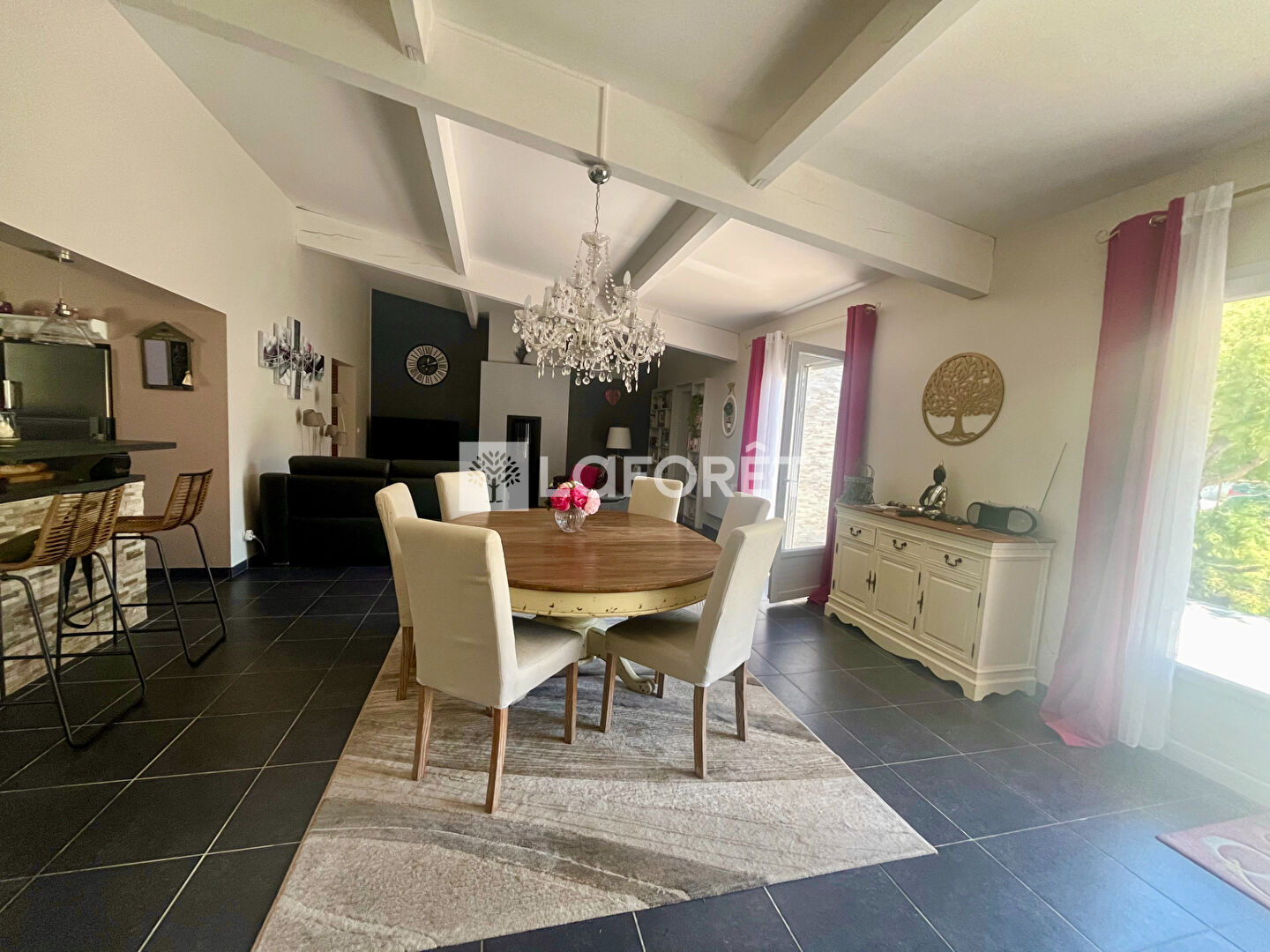 Dés son entrée découvrez un beau salon - séjour avec son poêle à pellets, sa cuisine ouverte et équipée, le tout donnant sur le jardin.