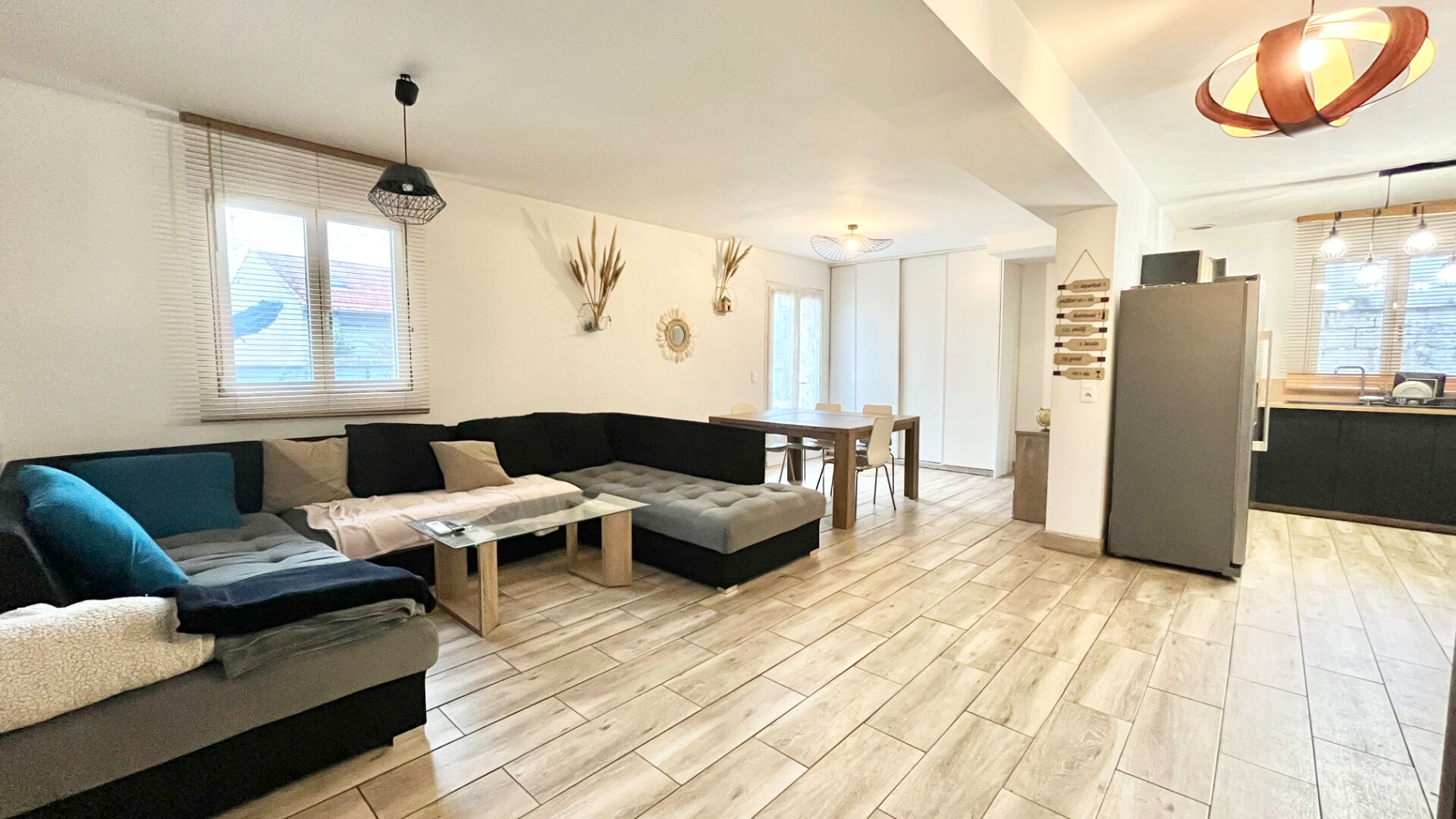 La maison se compose d'un grand salon séjour avec sa cuisine équipée et moderne, un dégagement avec placard intégré dessert 3 chambres dont une avec sa mezzanine, une salle d'eau et un WC séparé.