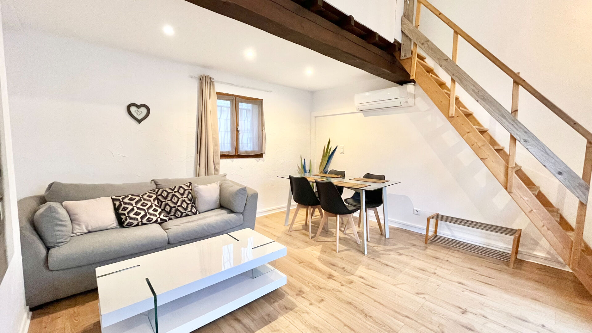 Pour l'appartement : un séjour, une cuisine équipée, 2 chambres en mezzanine, salle d'eau.