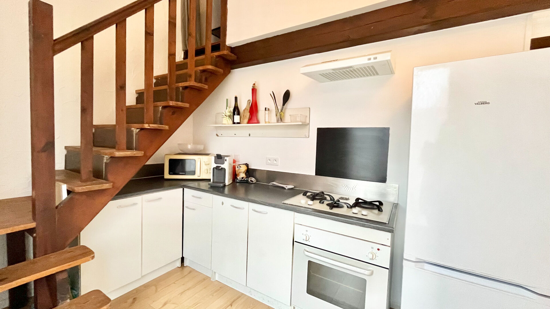 Pour le studio : un séjour et sa cuisine aménagée, une salle d'eau et une chambre en mezzanine.