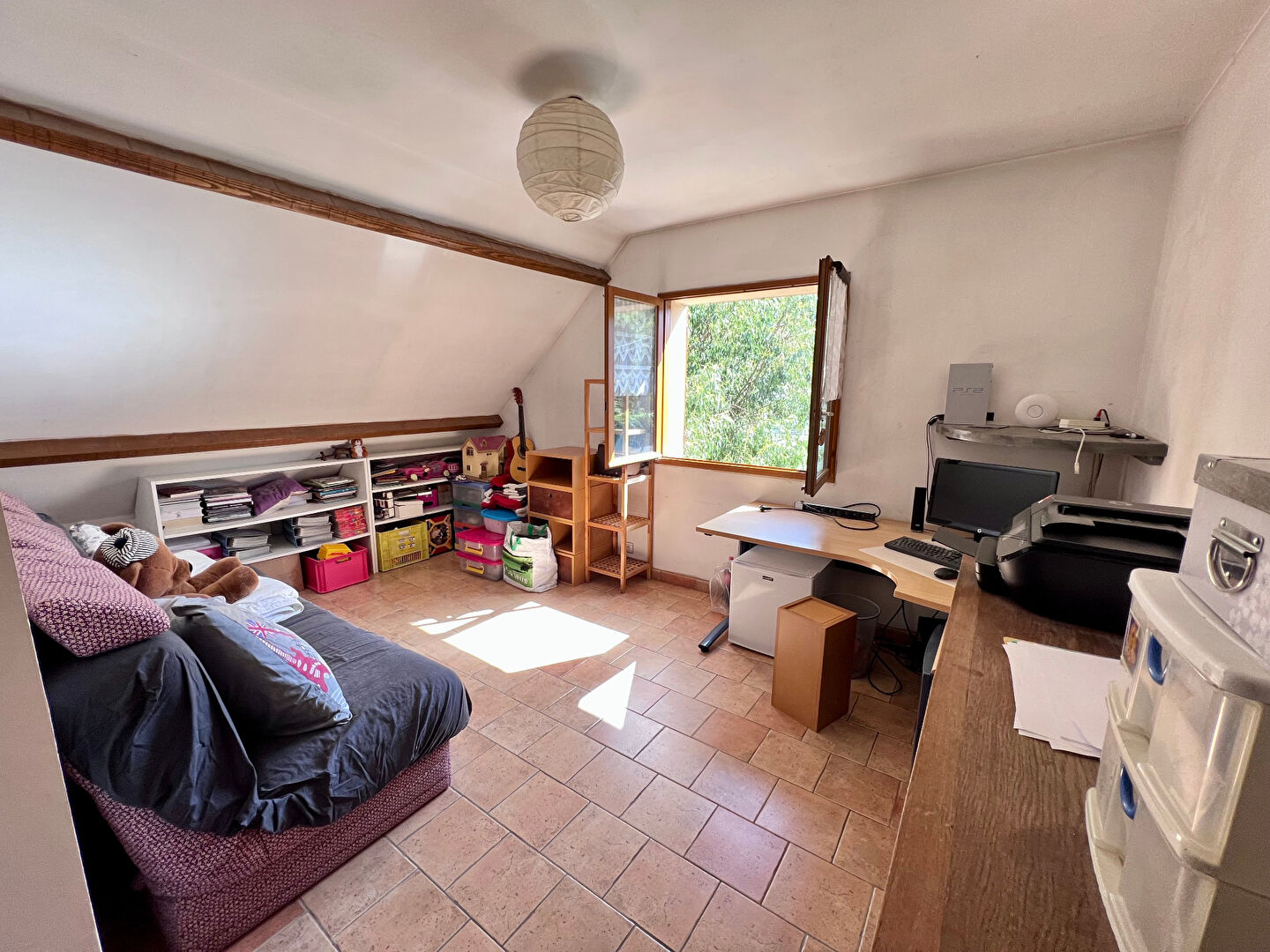 Le rez-de-chaussée est composé d'un vaste séjour salle à manger de 38m², TRÈS LUMINEUX, d'une cuisine séparée, d'une chambre, d'une salle d'eau et d'un W.C séparé. À l'étage se trouvent 2 chambres spacieuses, une salle de bain ainsi qu'une pièce palière pouvant être transformée en une quatrième chambre et un grenier (pouvant faire office de bureau).