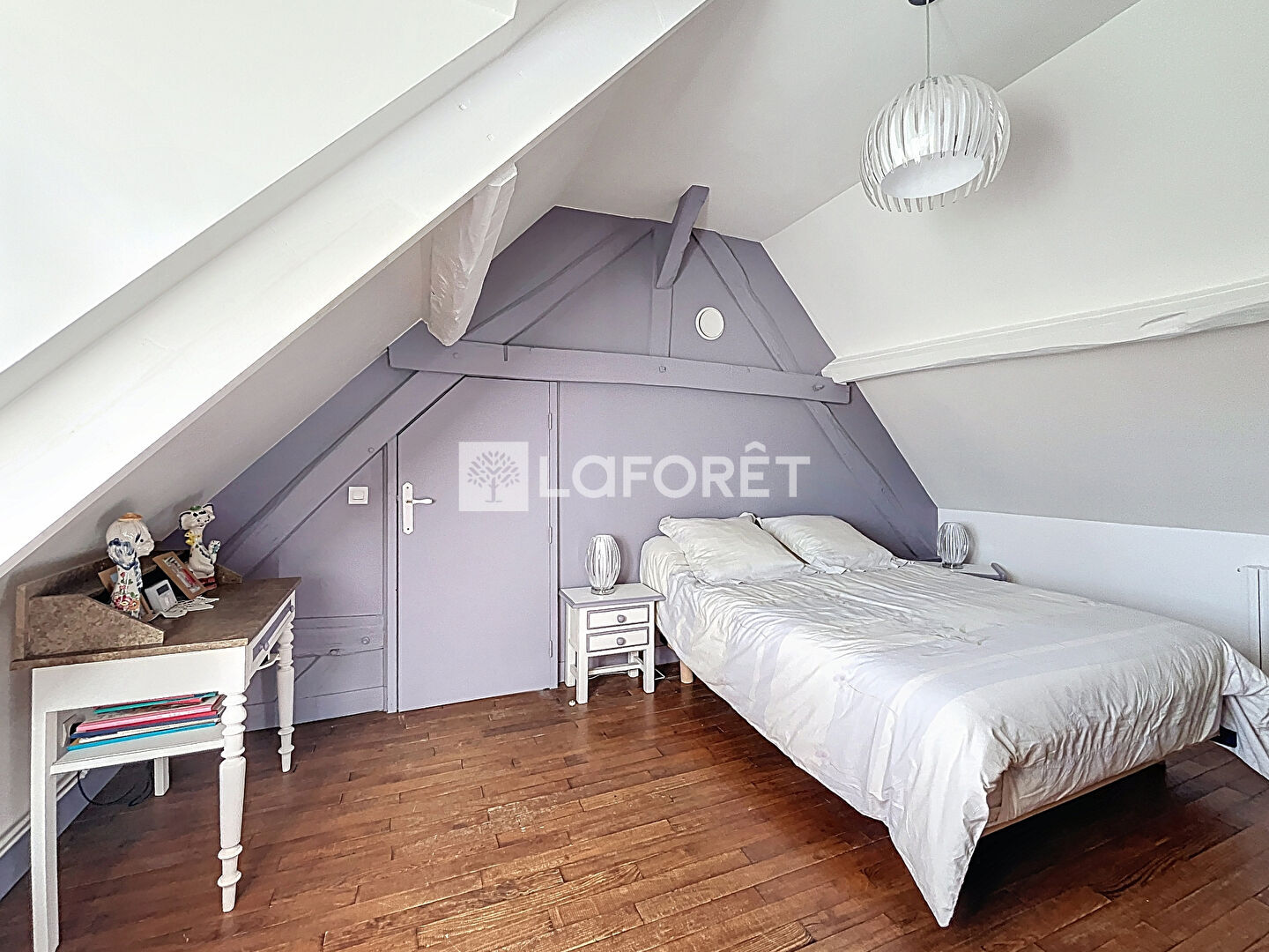 Elle offre une belle pièce de vie lumineuse d'environ 35 m², une cuisine aménagée et équipée, buanderie et cave. À l'étage, deux chambres dont une avec salle de bains et douche, ainsi qu'une troisième chambre accessible par un second escalier.