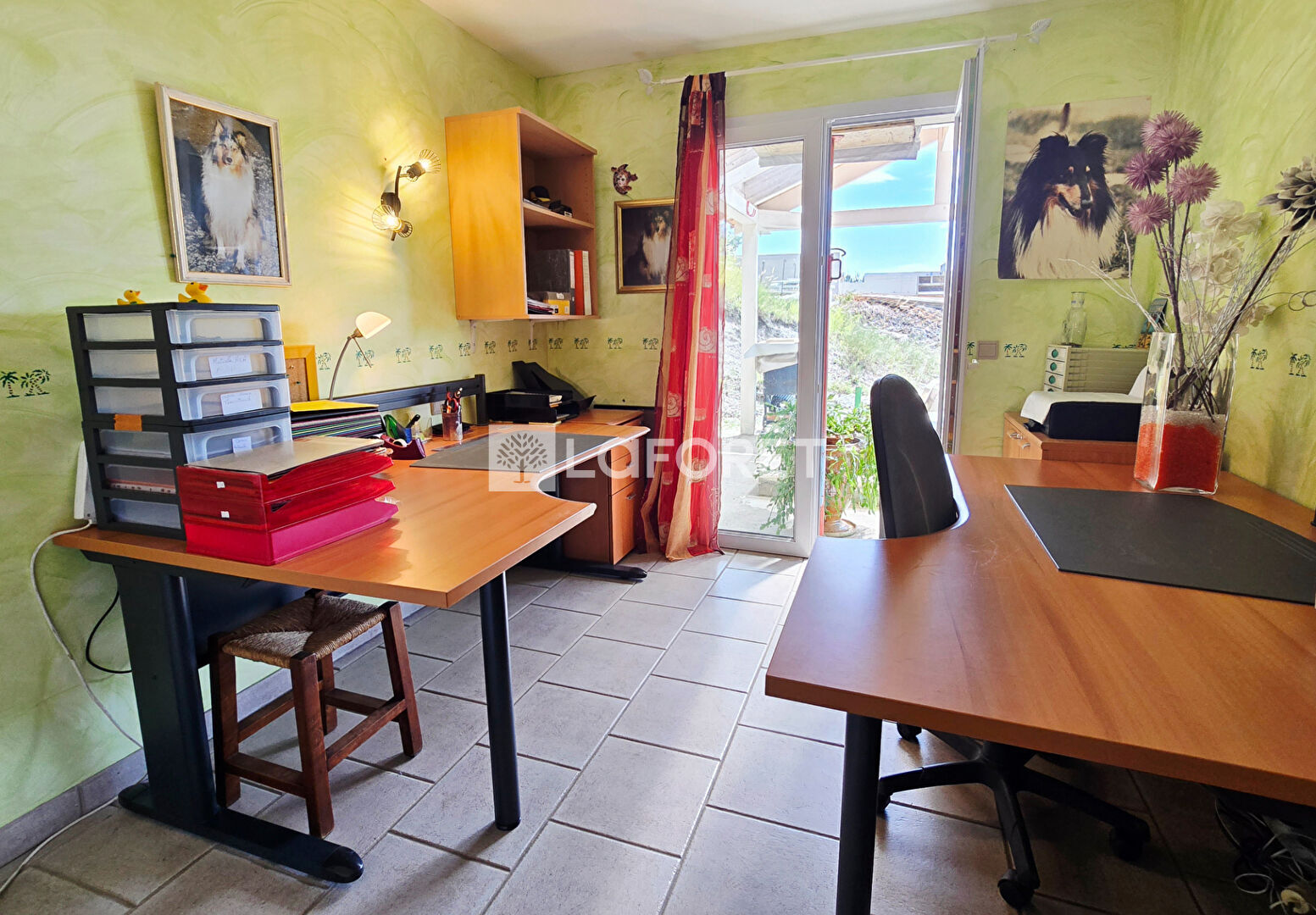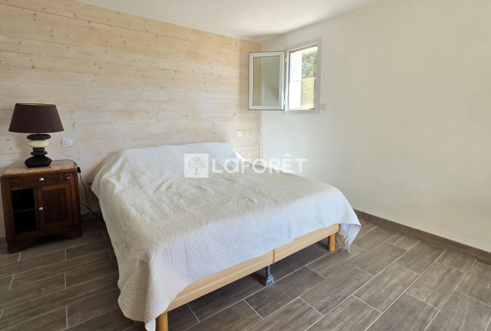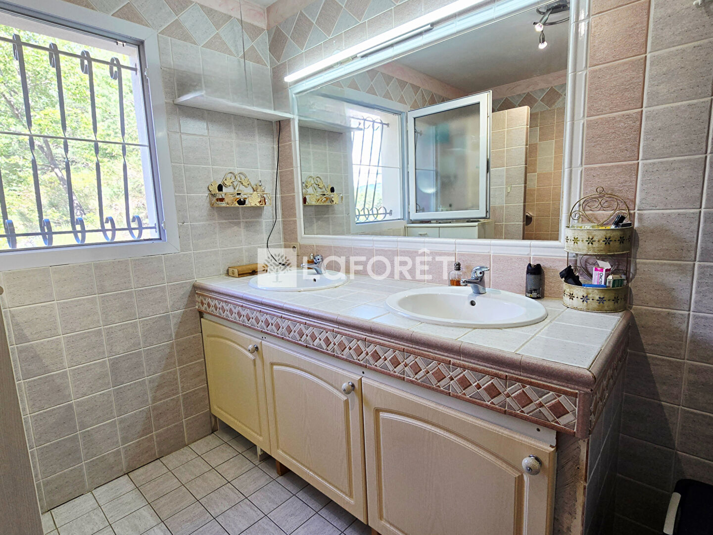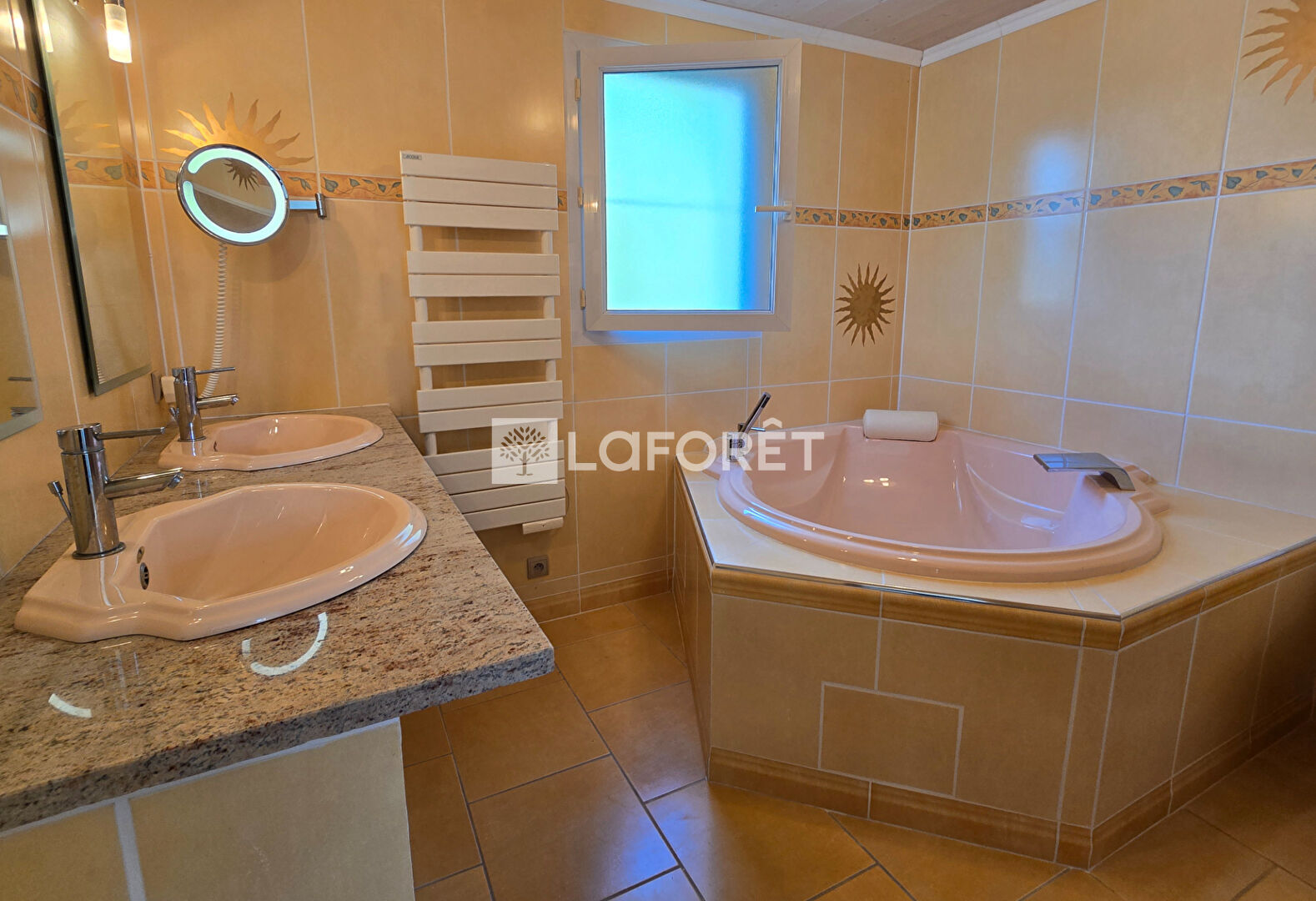 Au rez-de-chaussée, un confortable salon/séjour avec poêle à granules et accès direct sur la terrasse, une cuisine séparée, un cellier, une salle d'eau avec double vasque ainsi que deux chambres avec placard et accès terrasse.