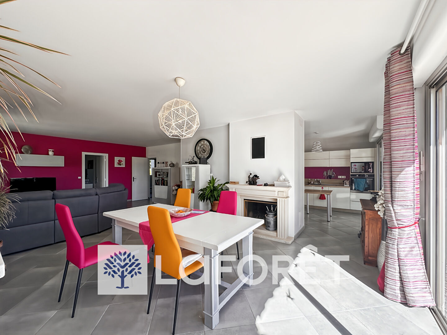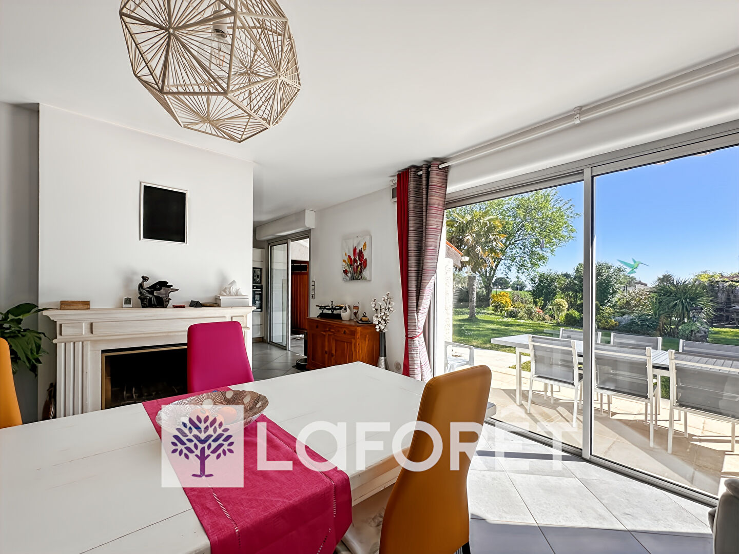 L'entrée s'ouvre sur un séjour lumineux de 42 m² avec cheminée (foyer ouvert), prolongé par une véranda spacieuse de 26 m².