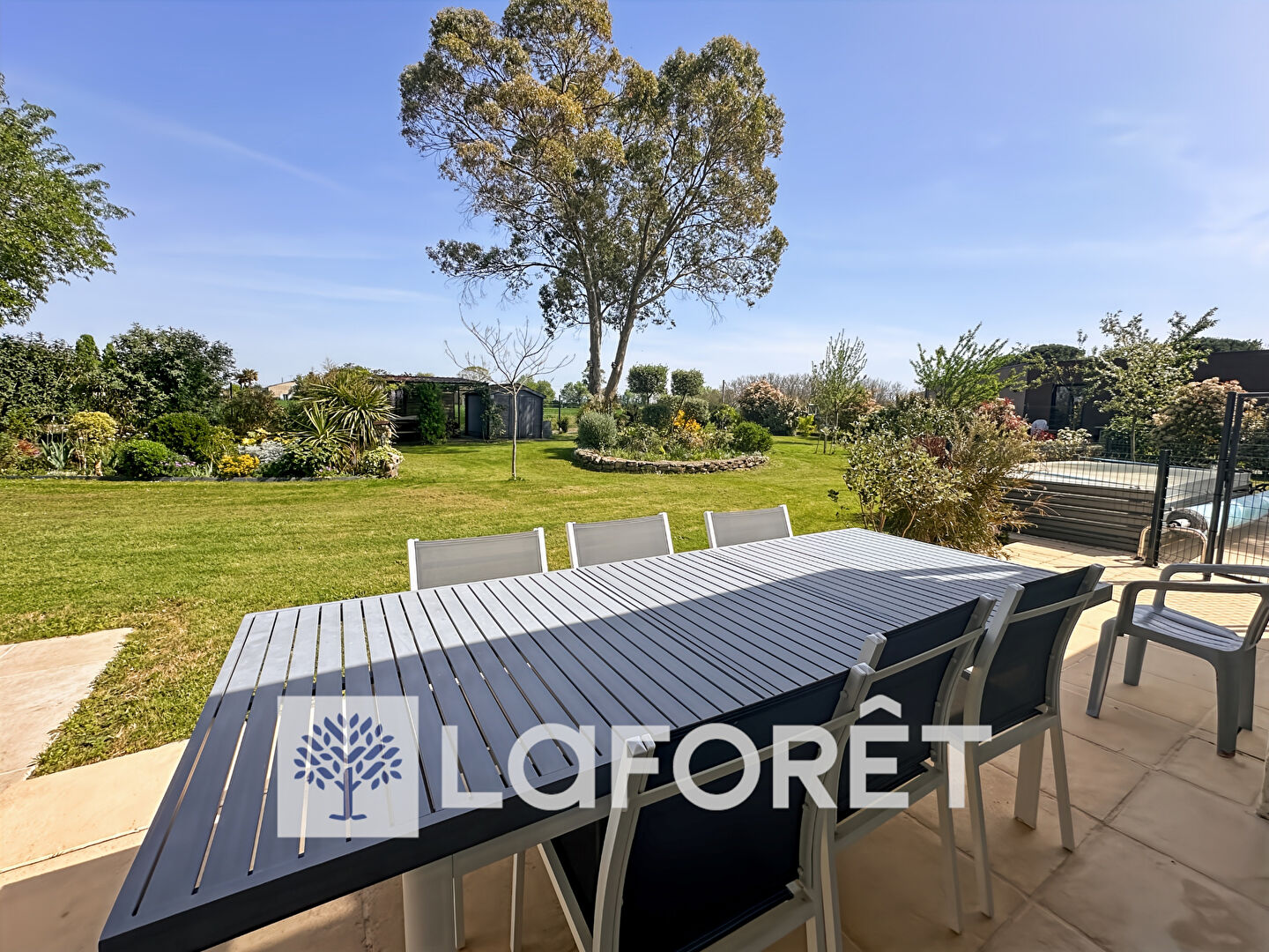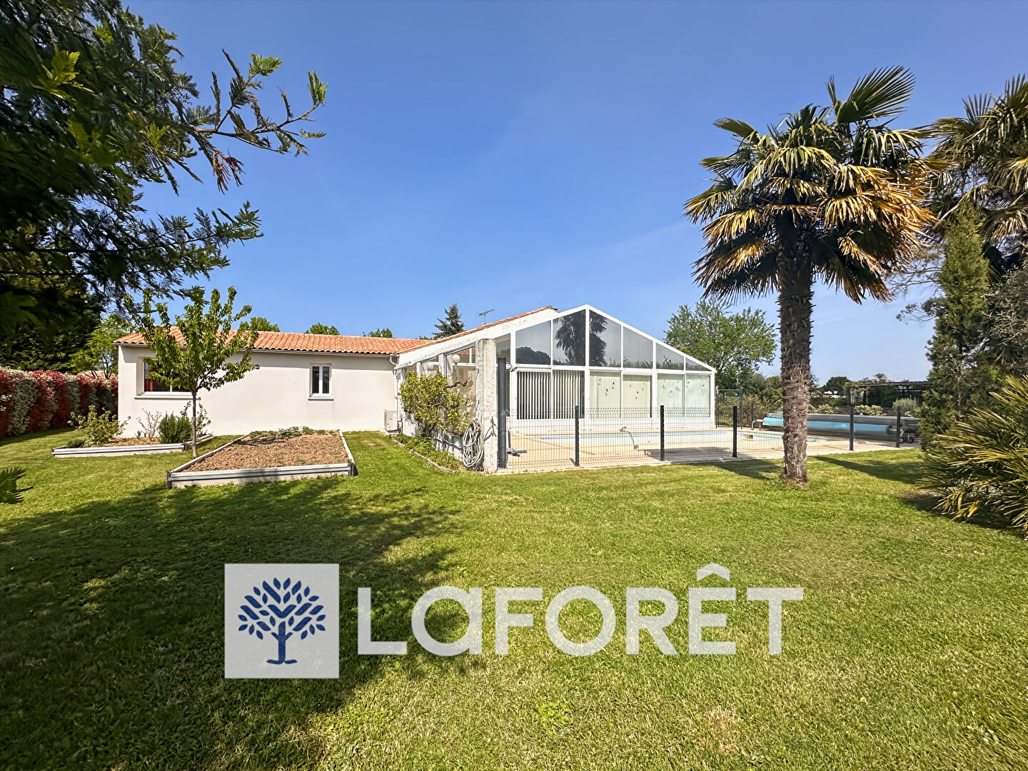 Le terrain de 2 286 m² (avec forage) est entièrement clos et accueille une piscine chauffée de 9 x 4 m (avec profondeur progressive), avec pompe à chaleur + abri télescopique.