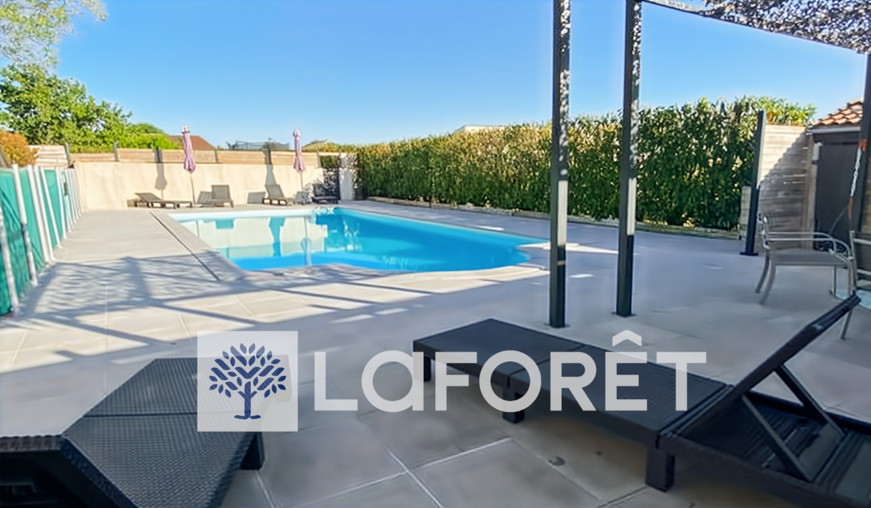 Le terrain est clos et agrémenté d'une piscine 10 × 5 m avec liner en bon état. Une terrasse complète l'ensemble. L'accès est rapide et direct aux axes principaux, facilitant l'arrivée des vacanciers et des clients.