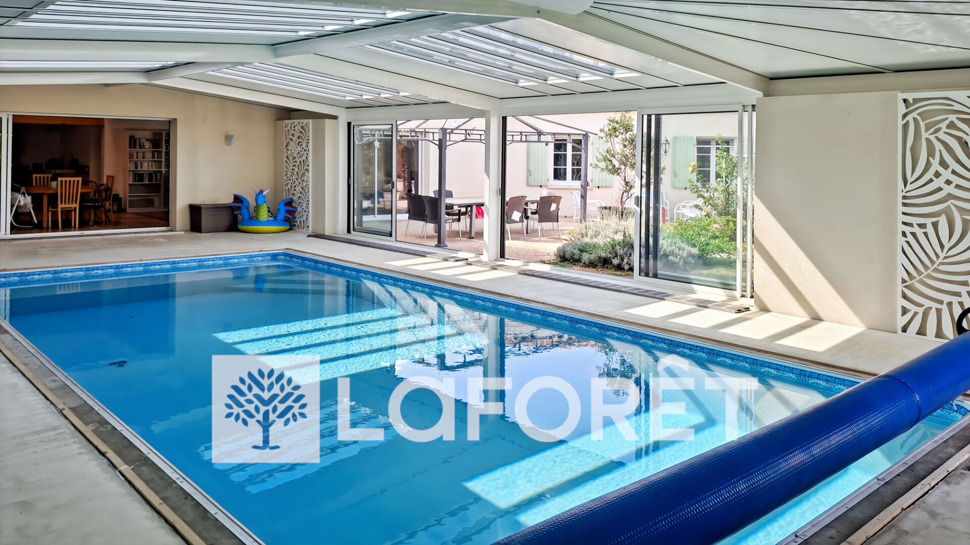Piscine couverte et chauffée (9 x 4 mètres) avec véranda accessible depuis le séjour avec local technique;