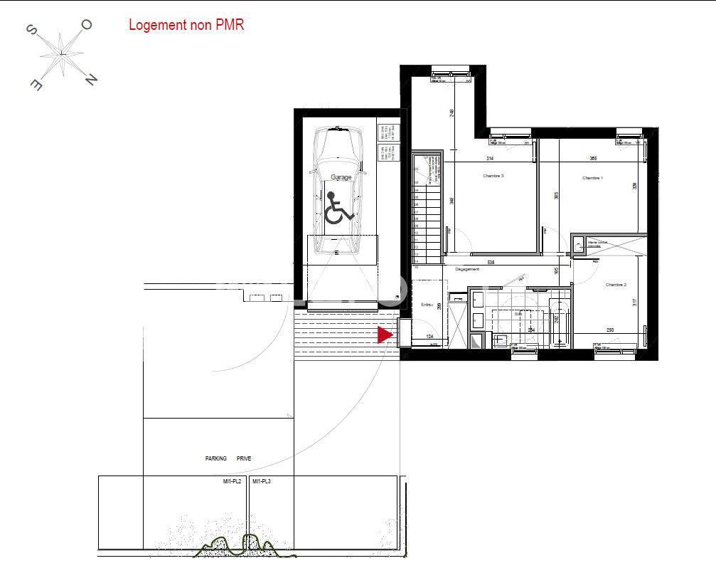 - Au rez-de-chaussée (sur rue) : entrée, trois chambres, salle de bains avec WC.