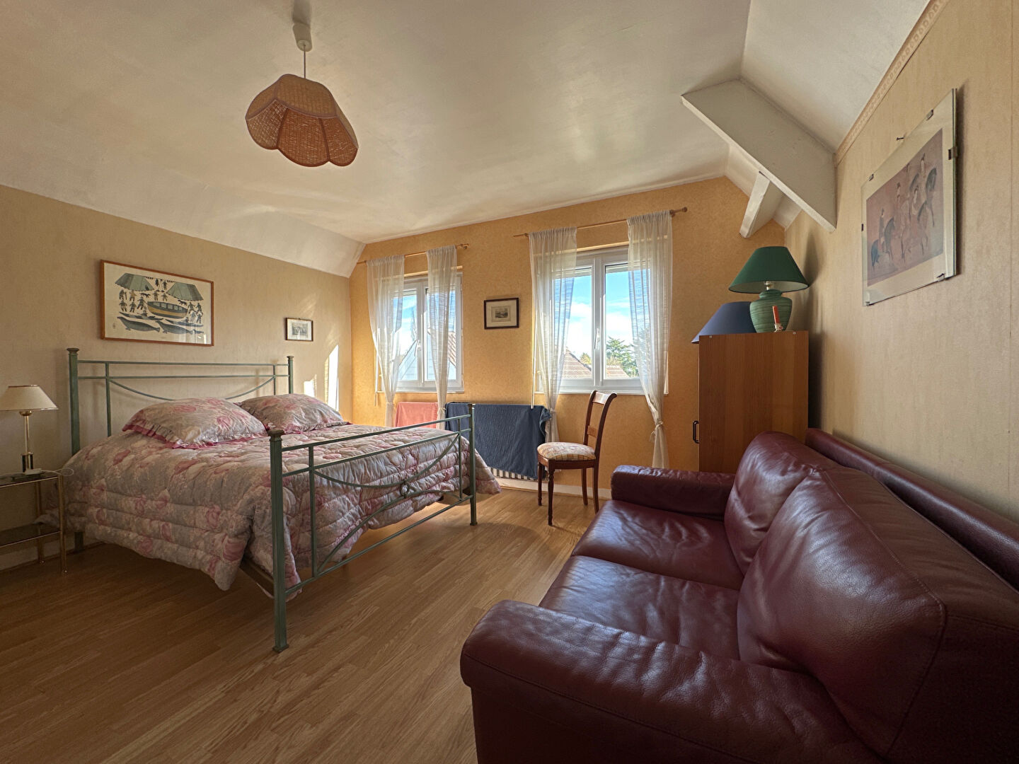 A l'étage, les combles sont aménagés en deux grandes chambres avec de nombreux rangements ainsi qu'une salle de bains avec WC.