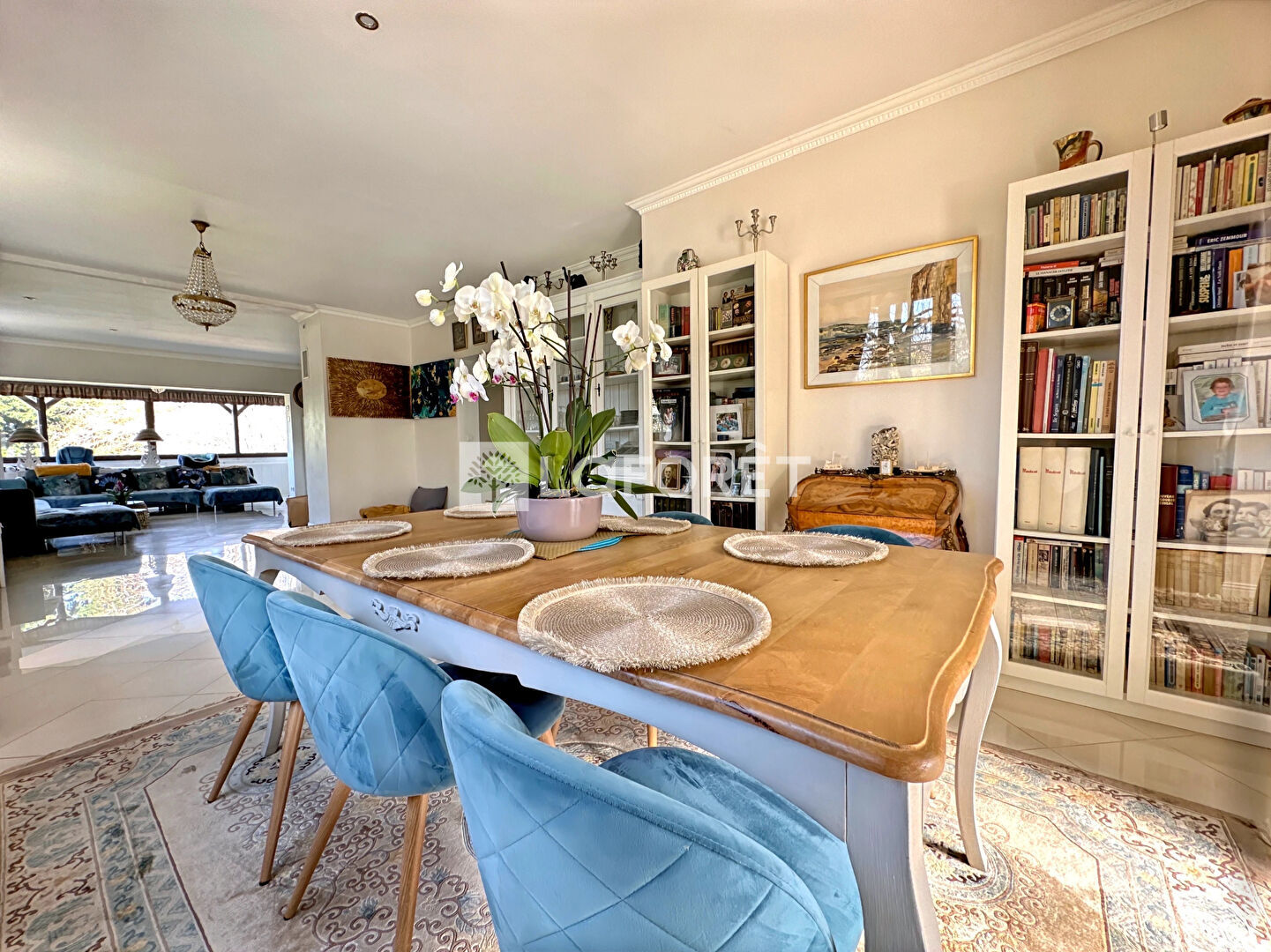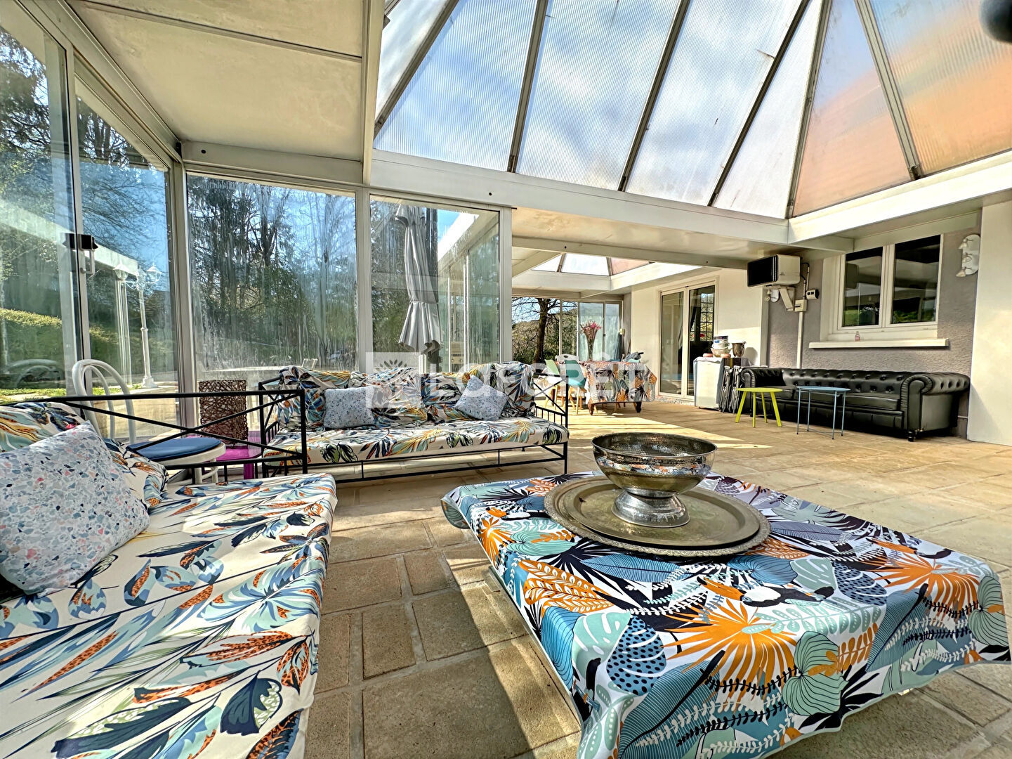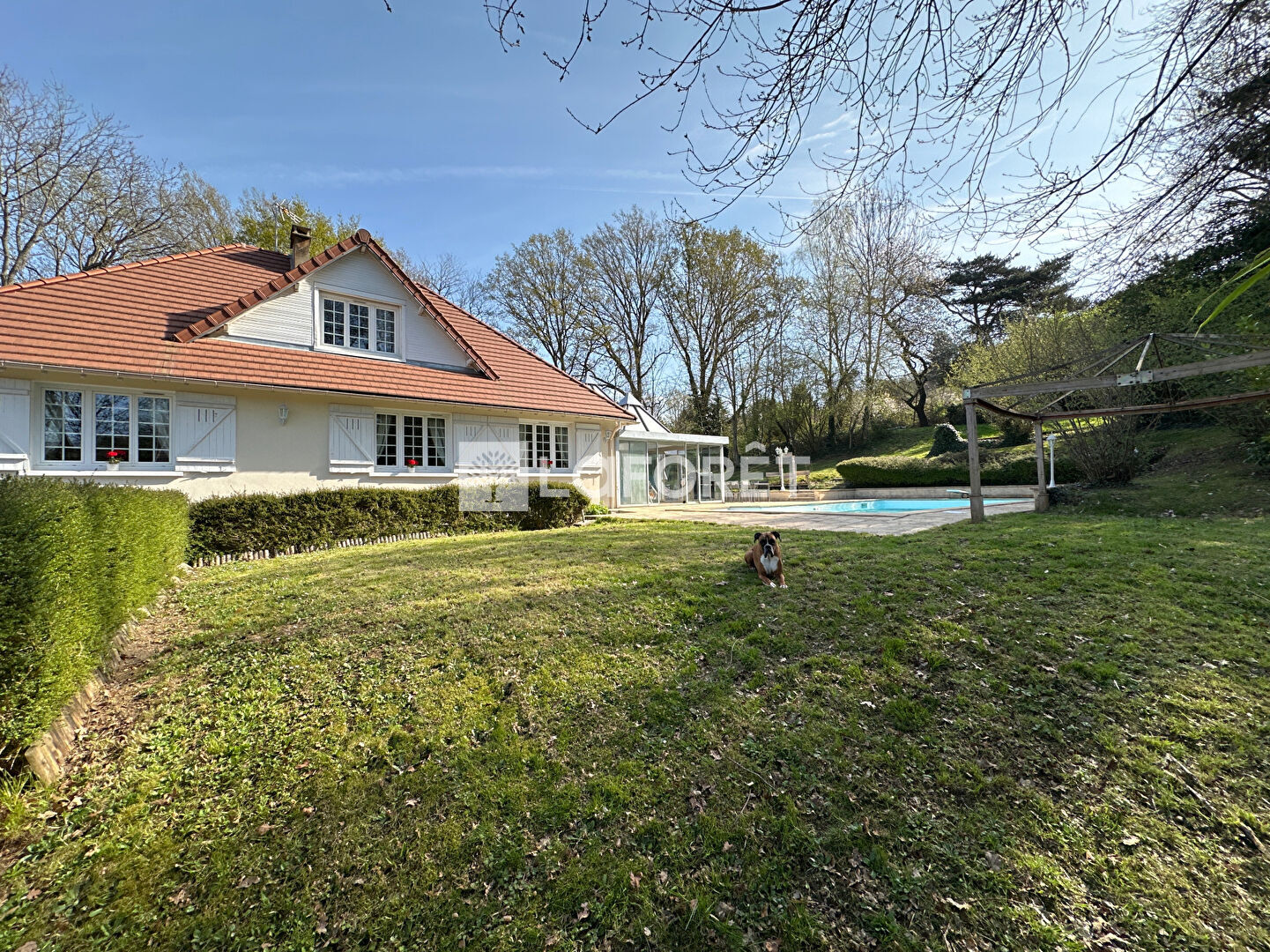 La maison est construite sur une parcelle de plus de 2300m² arborée et agrémentée d'un espace de vie extérieur exceptionnel composé d'une vaste véranda donnant accès à la terrasse ainsi qu'à la piscine chauffée. Cet espace rare permet de recevoir même en nombre en toute saison.