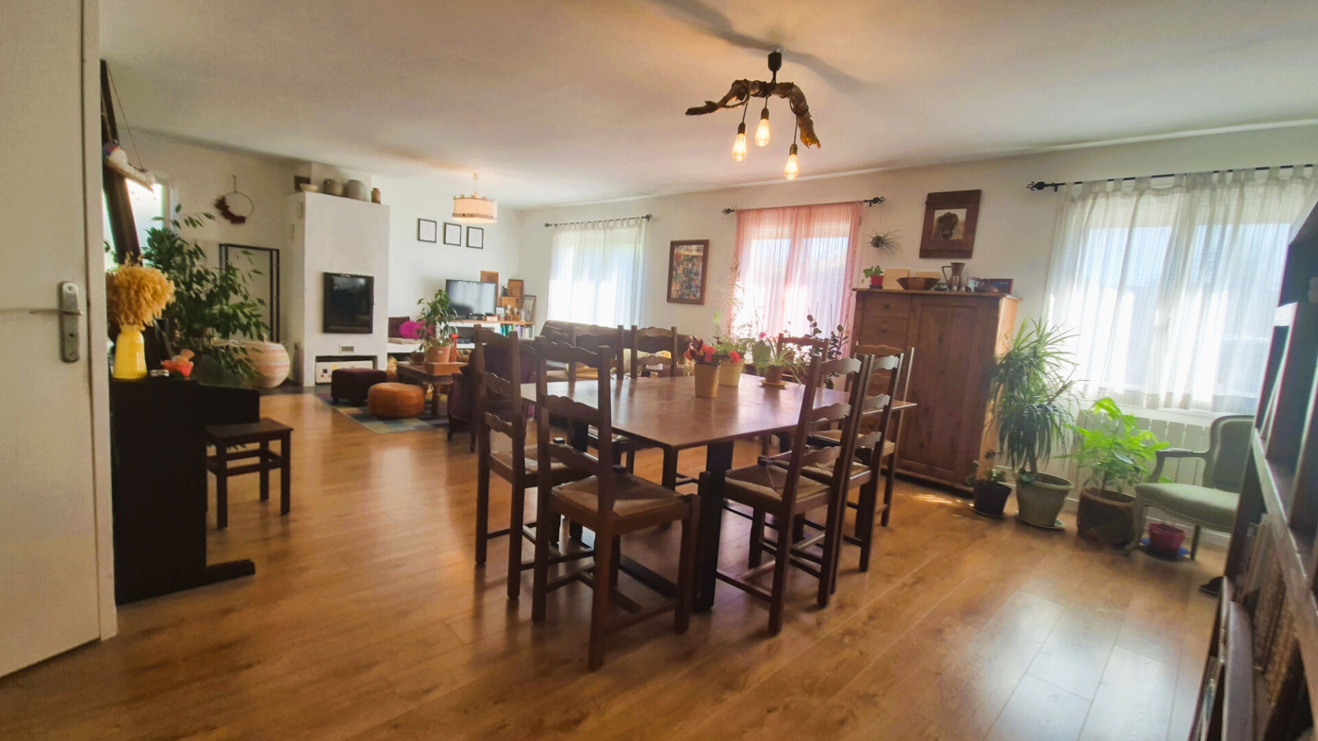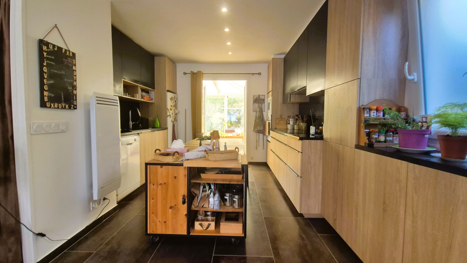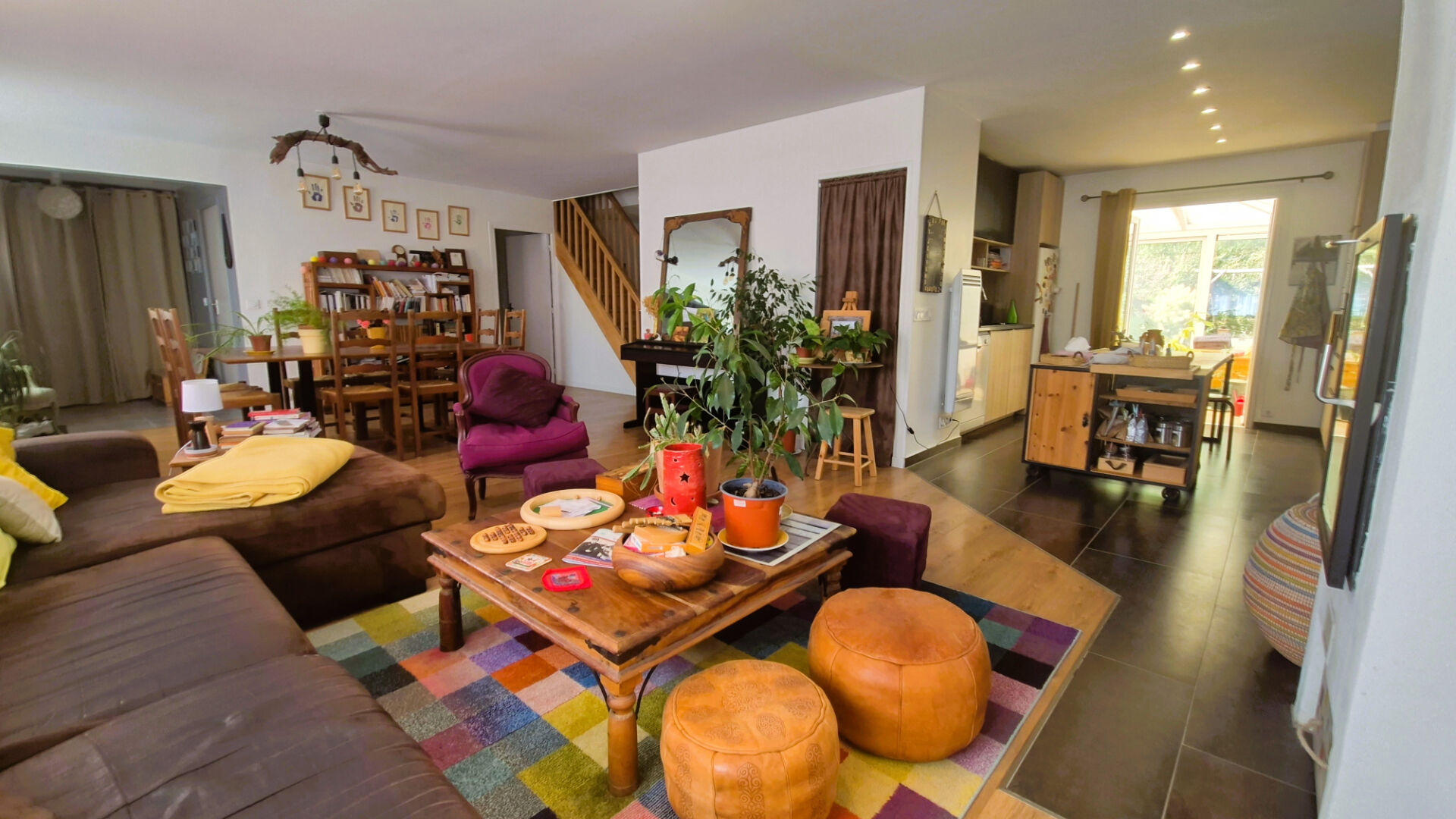 Au rez-de-chaussée une vaste entrée avec un accès sur un cellier, un double séjour lumineux avec 5 ouvertures, cuisine ouverte entièrement aménagée et équipée, poêle de masse. un accès à un dégagement pouvant faire office de coin bureau, une véranda, salle d'eau avec W.C et une chambre ;