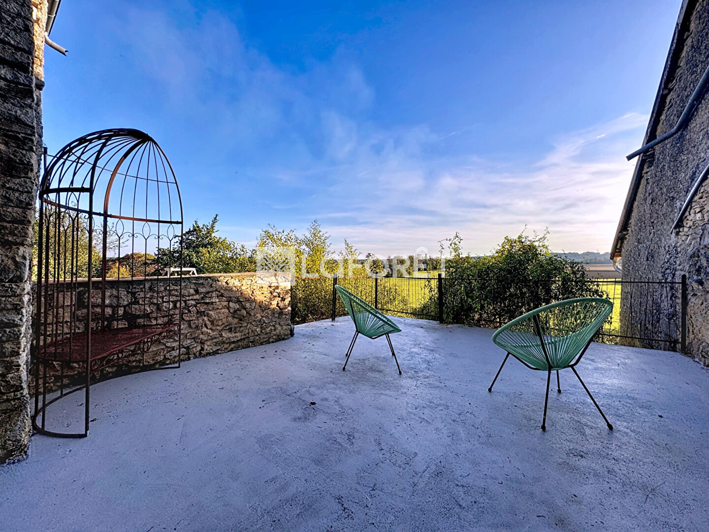 Le terrain arboré bénéficie d'une vue dégagée sur les prairies et un cours d'eau, apportant une atmosphère paisible et bucolique.