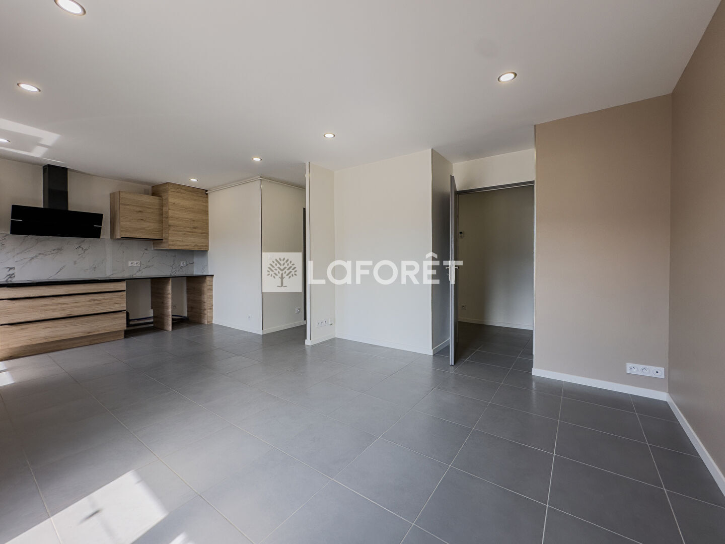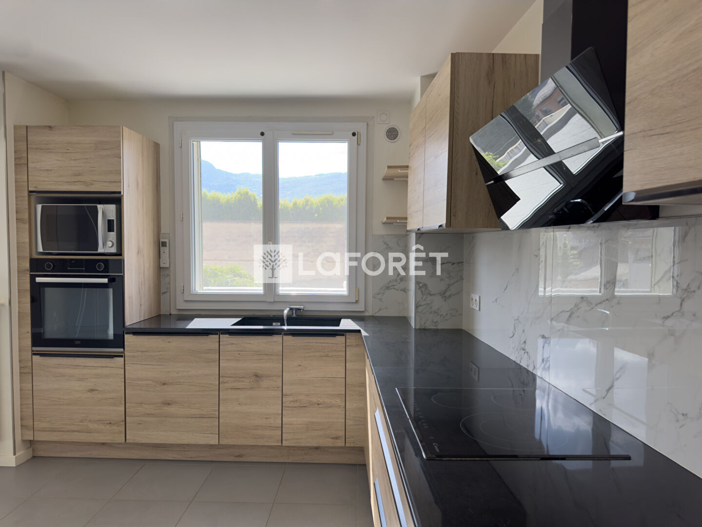Séjour double climatisé et d'exposition Ouest. Cuisine ouverte équipée avec grand plan de travail en pierre. Balconnet.