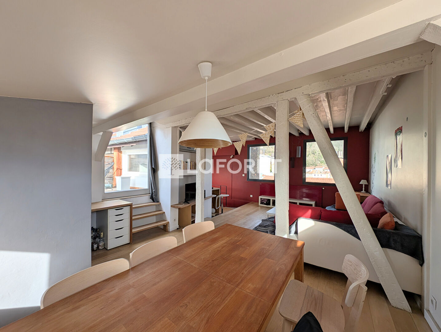 Surface totale d'environ 90 m² pour ce duplex composé d'une vaste pièce à vivre lumineuse de 40 m² sur terrasse de 5.6 m² avec vue sur les toits. Cuisine équipée attenante au séjour. 3 chambres. Deux salles d'eau avec wc. Faibles charges, 622.46 euros / an. Taxe foncière 1737 euros.