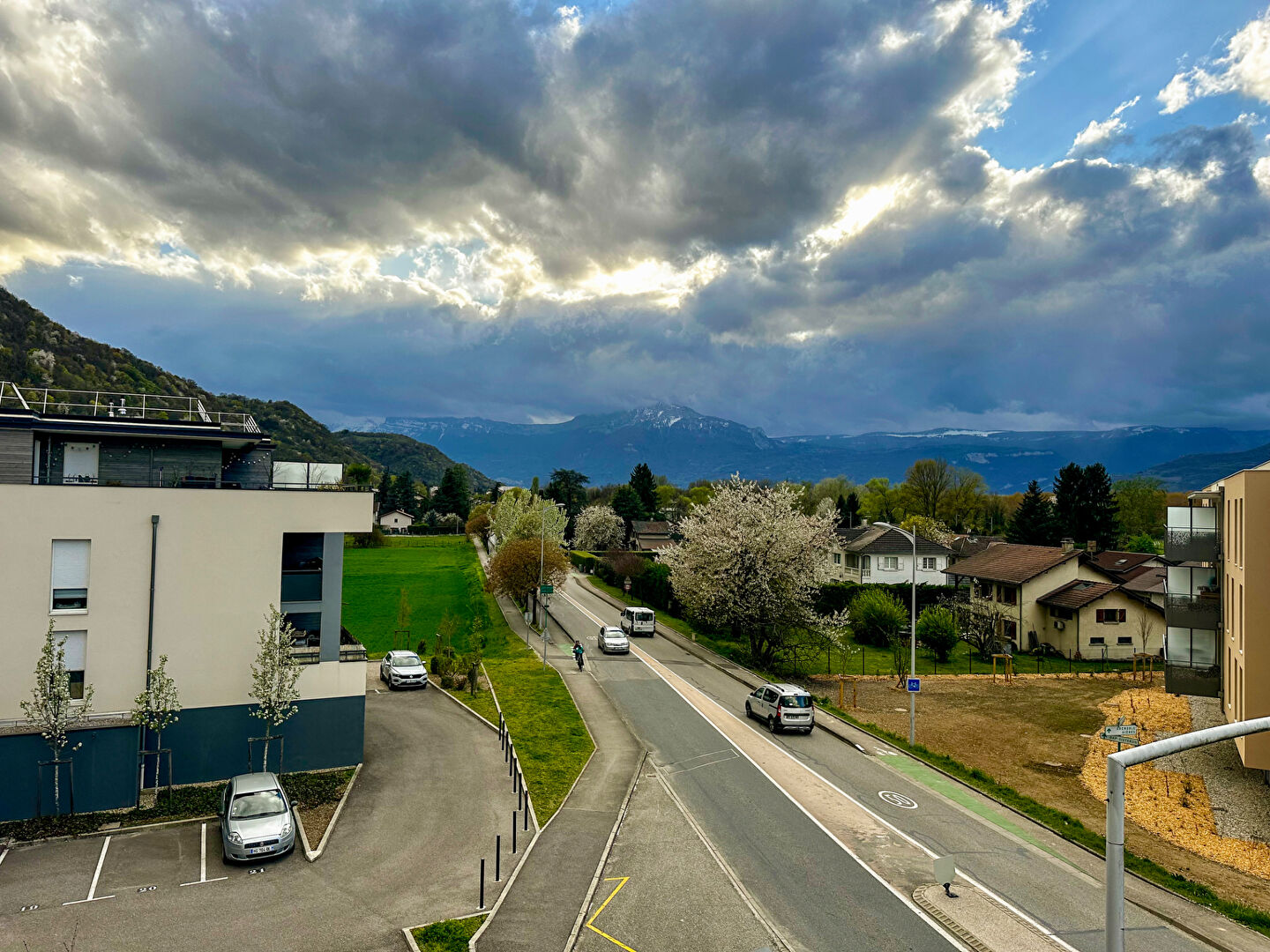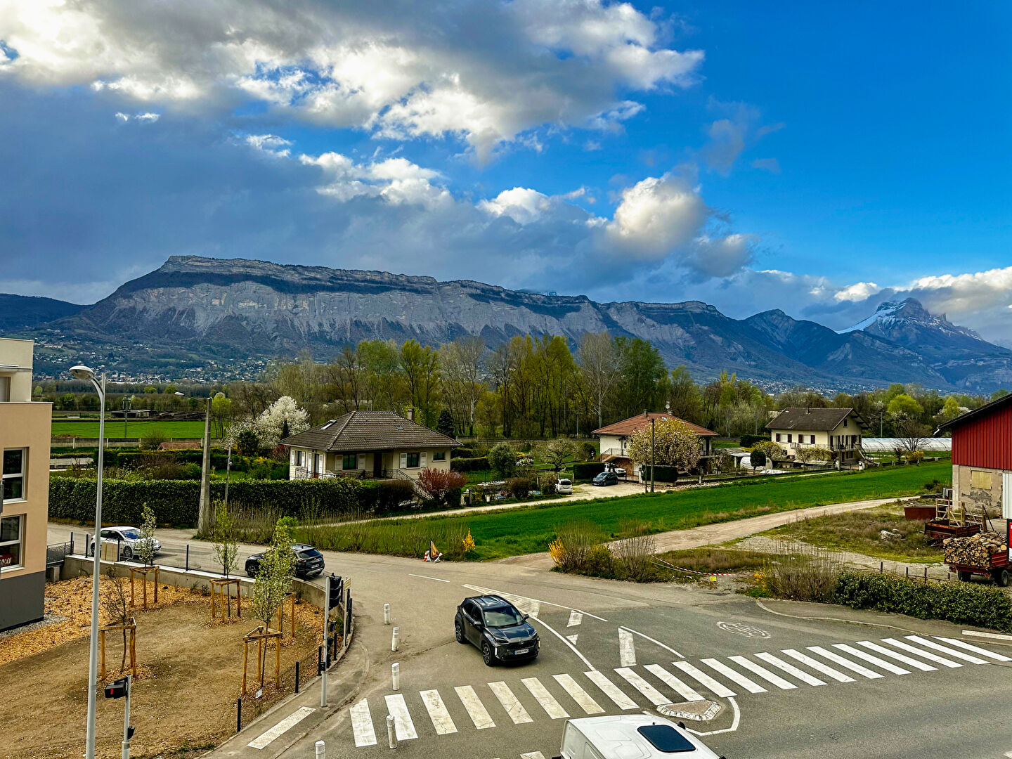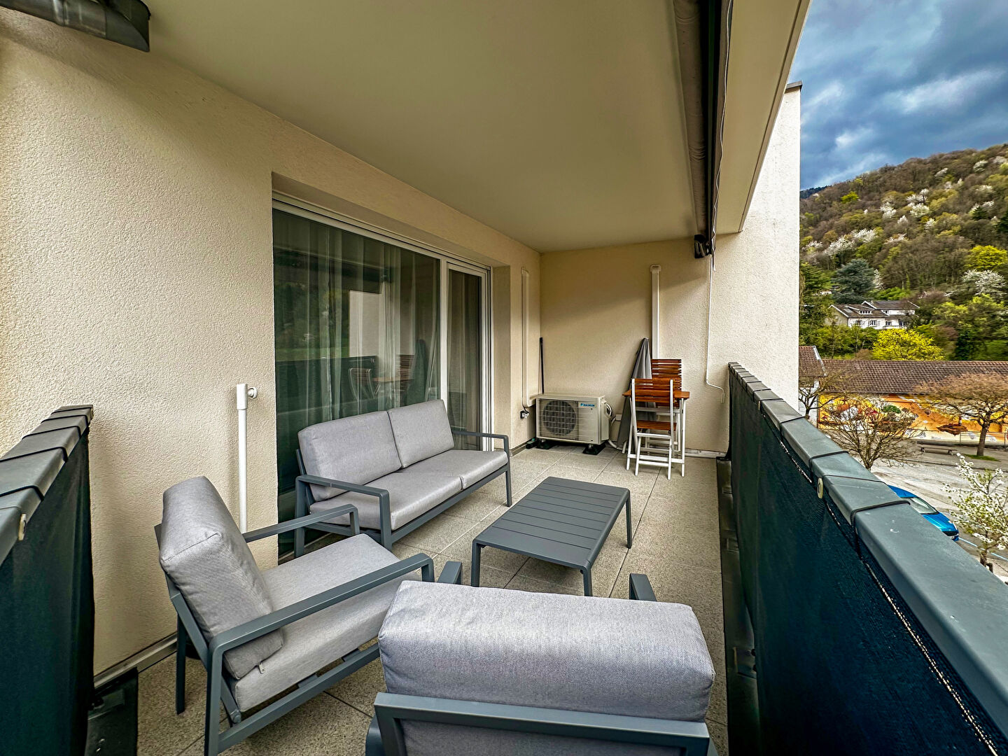 Terrasse d'exposition Sud Ouest avec vue dégagée sur la Chartreuse et le Vercors.