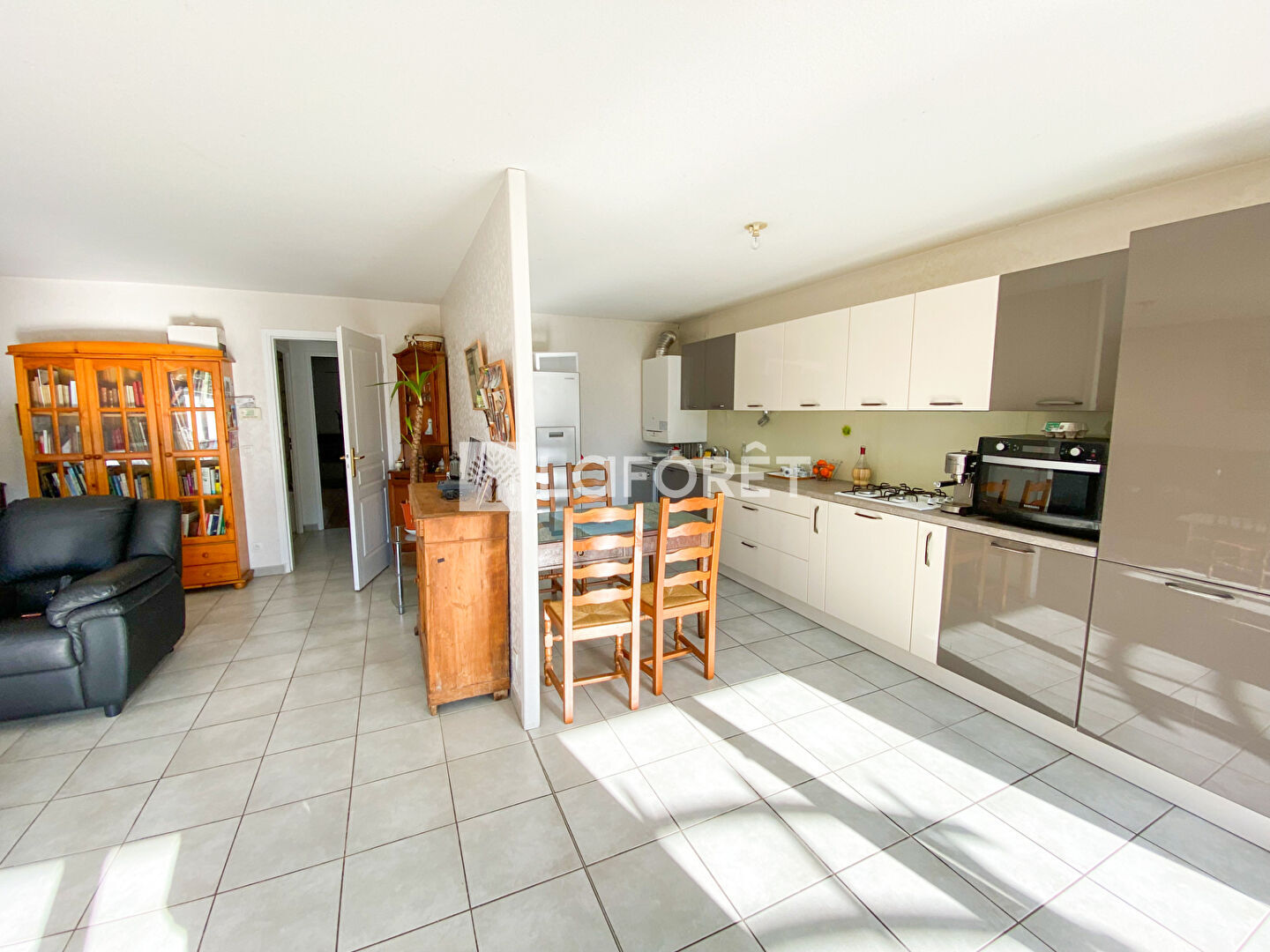 Pièce de vie spacieuse avec cuisine semi-ouverte aménagée.