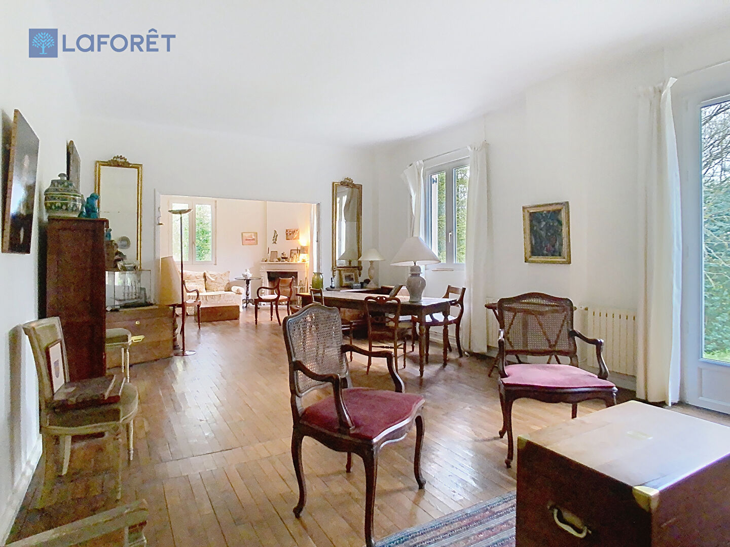 En partie rénovée, cette maison pleine de charme, dispose actuellement de 2 salons dont un de 50m² sur plancher chêne et de 4 chambres spacieuses, de 12 à 17m².
