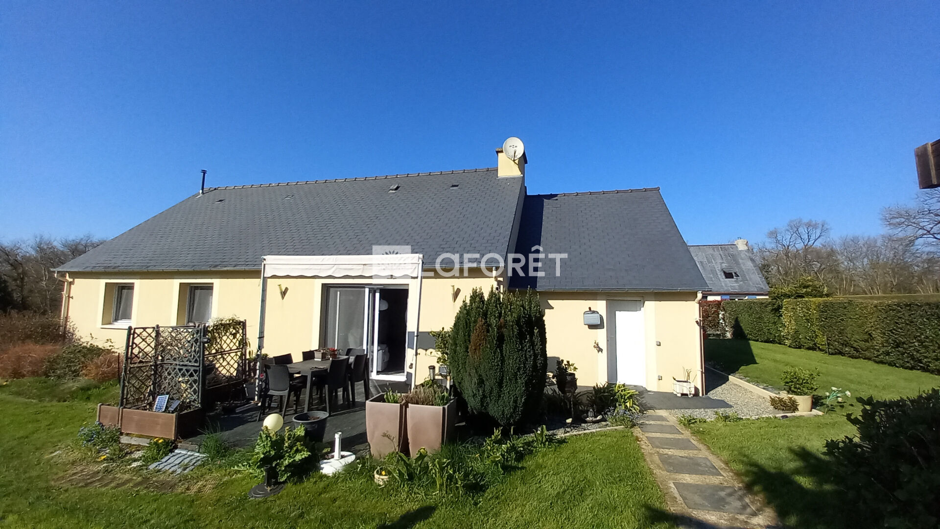 À l'extérieur, profitez d'une agréable terrasse exposée sud ouest, idéale pour vos soirées ensoleillées. Le tout est implanté sur un terrain paysagé d'environ 1170 m², offrant un cadre verdoyant.