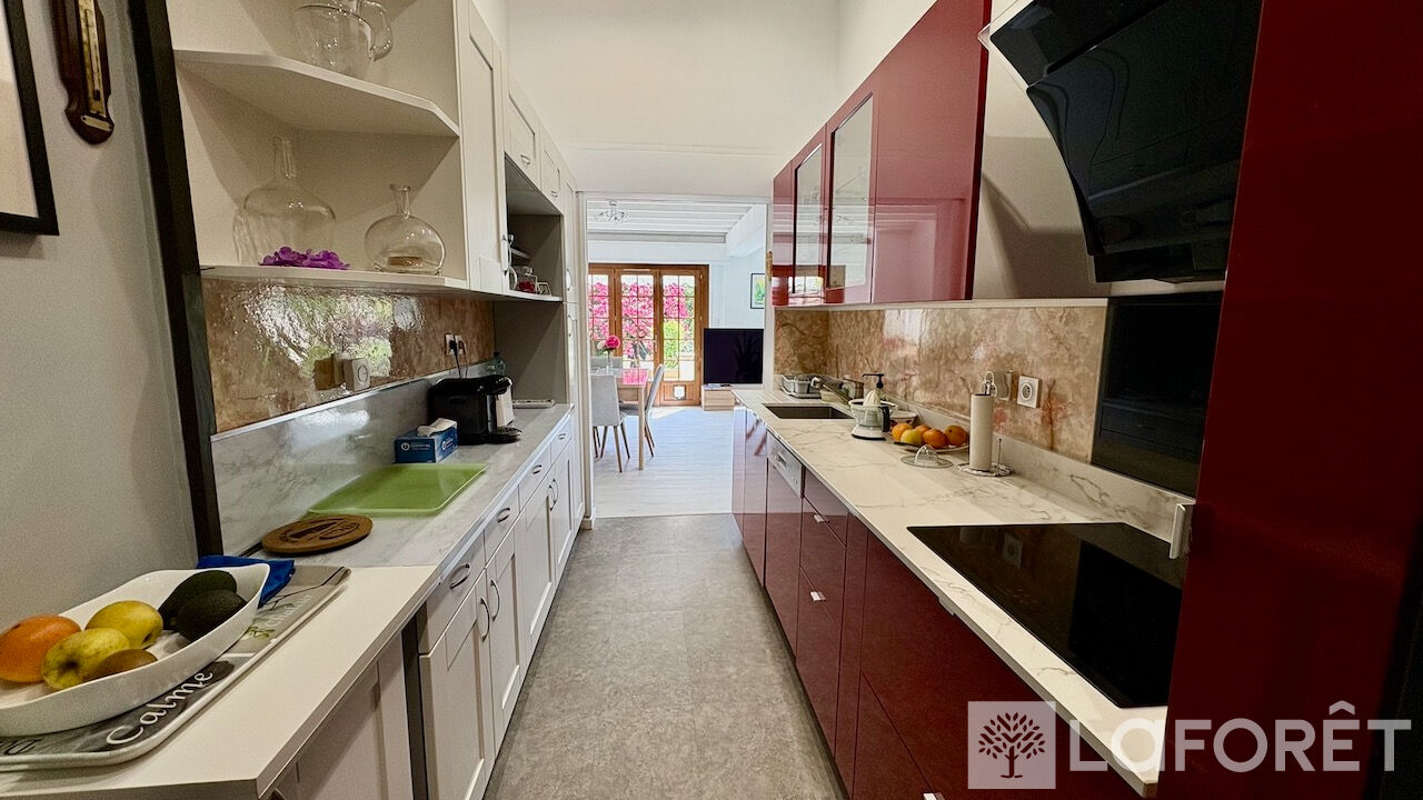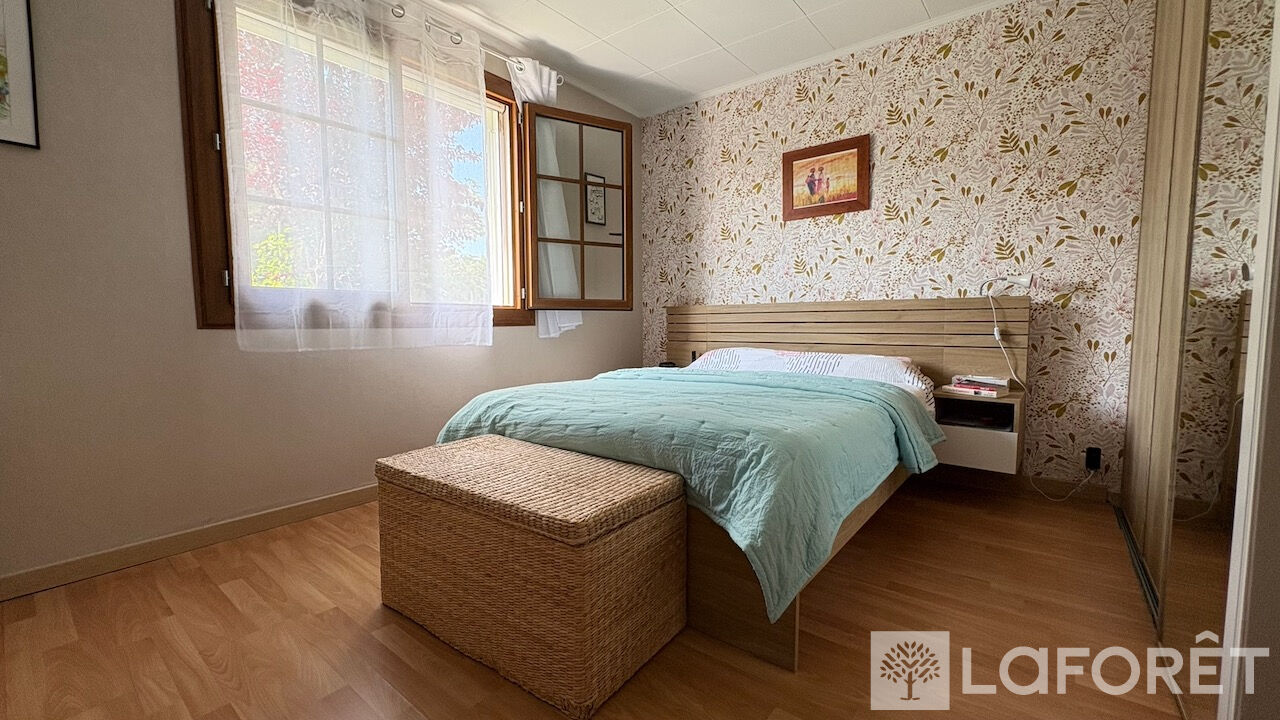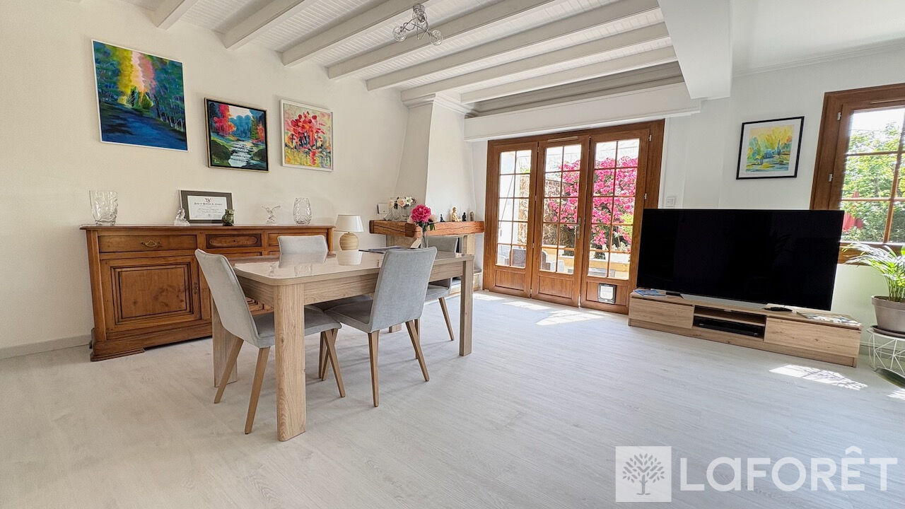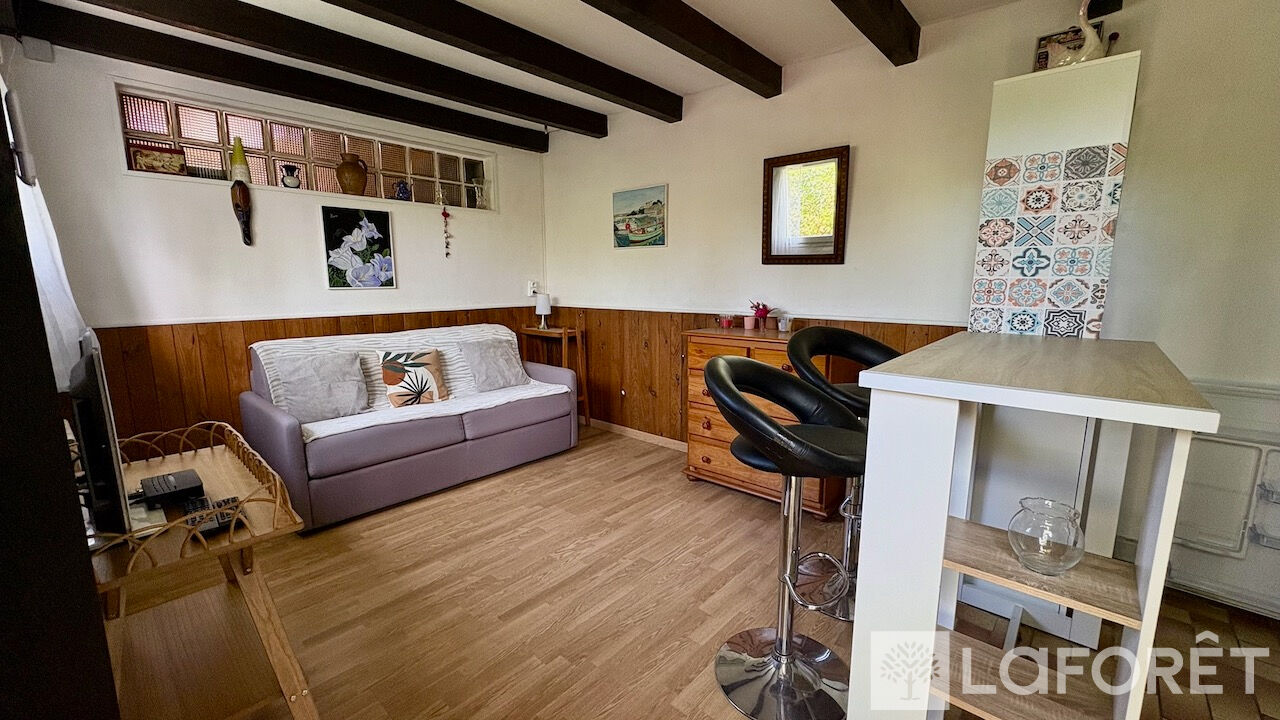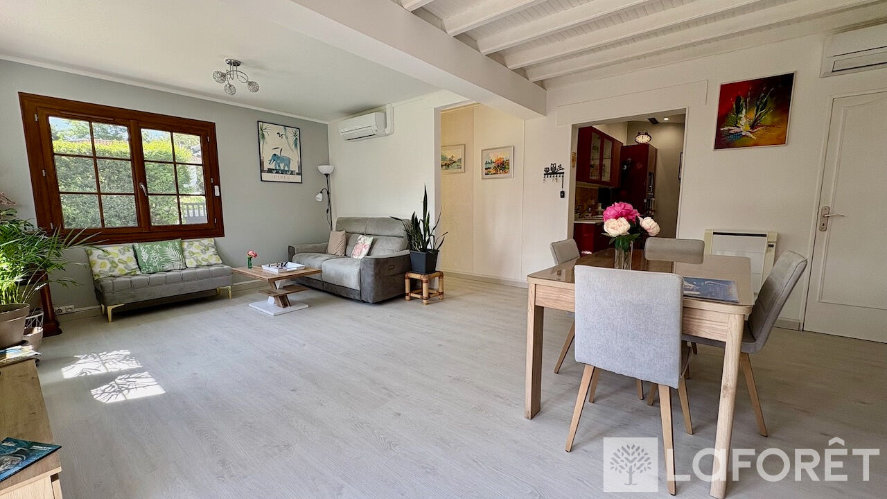 La pièce de vie, lumineuse et chaleureuse, propose un espace repas et un salon convivial. La cuisine aménagée et équipée apporte une ambiance moderne et fonctionnelle.